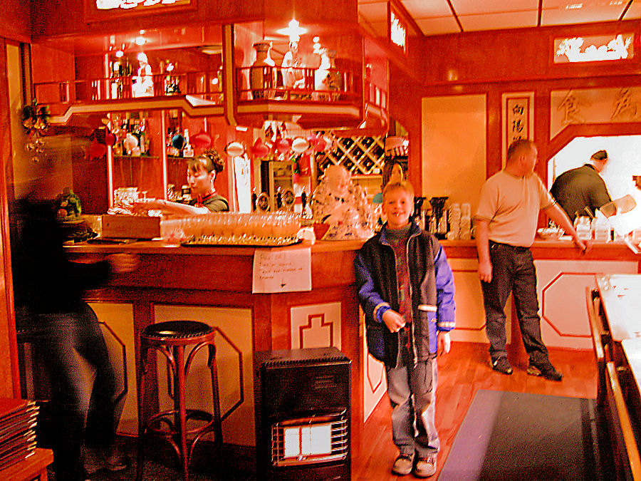 En lille tynd kinøjserdame med skarp sabel og en rød paraply. Jeg tror ikke man skal komme hende på tværs. Hvor mange timer mon hun bruger på at sætte håret?