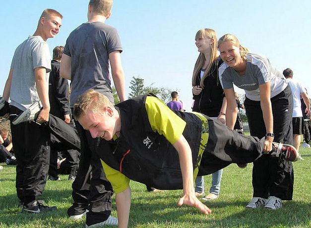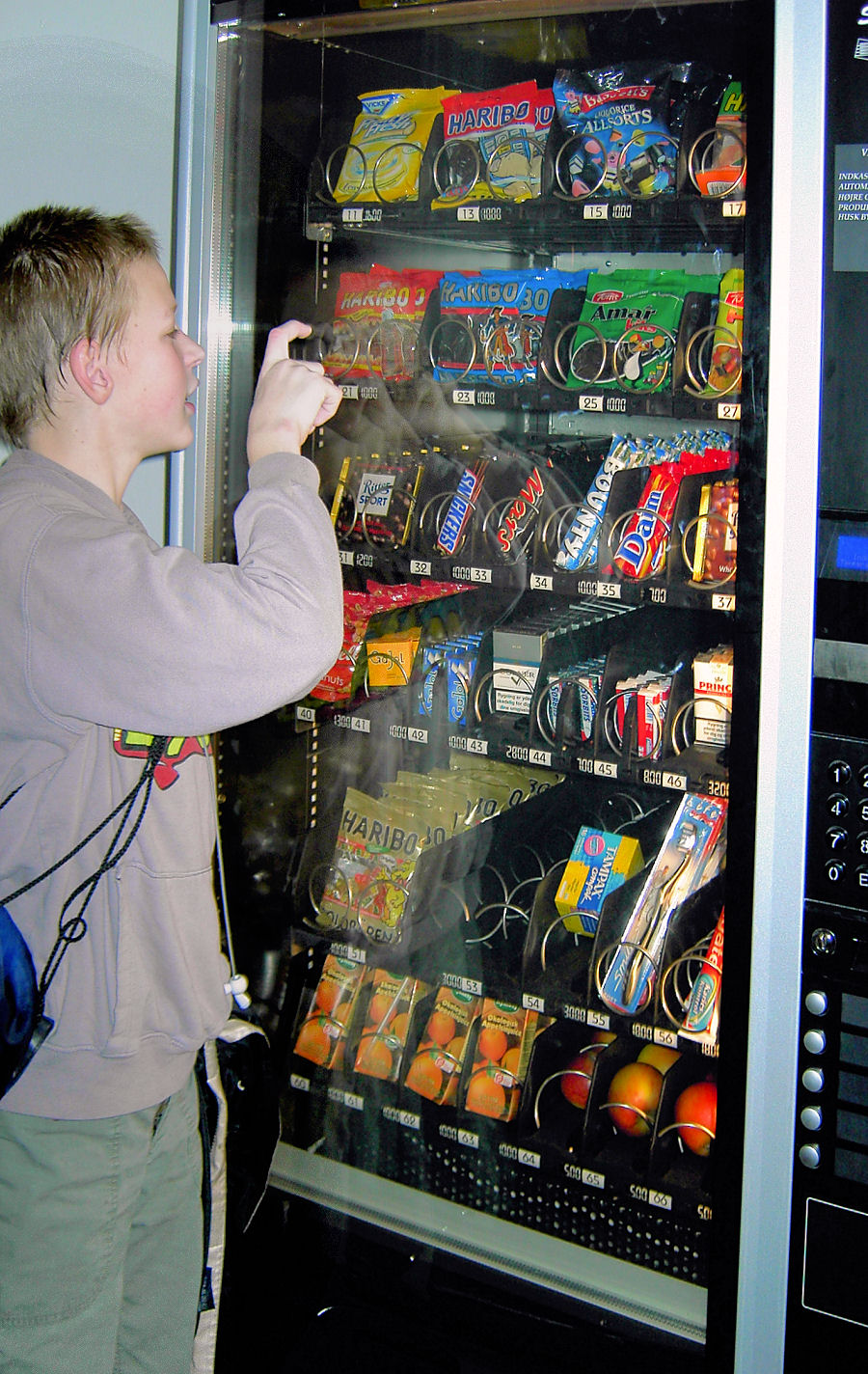 Vi skal lige have trukket noget slik i automaten på Gerlev idrætshøjskole. Sådan noget svømmeri giver sult.