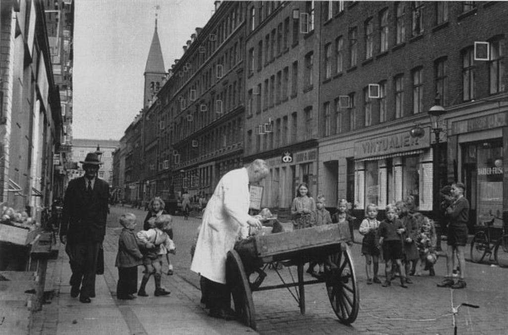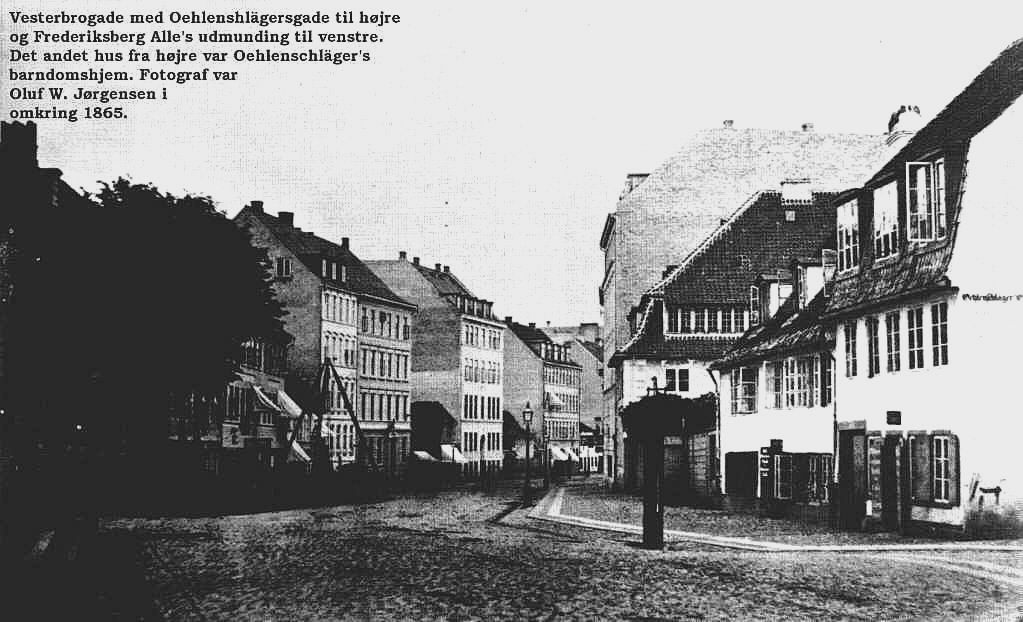Det her er Saxogade på Vesterbro i København. Jeg har ikke boet i denne gade, men i en der lignede den. Det er Vesterbrogade man ser oppe for enden. Man kan se det er sommer for alle har et vindue smækket op for at få lidt luft ind i de små lejligheder. Bemærk lygtepælen inde på fortovet. Sådan en var der lige ud for vores stuevindue i gaden . Hver aften kom der en lygtetændingsmand og tændte den. Han havde en stang med ild i og så kunne han med stangen dreje på en lille hane i lygten så gassen slap ud og så blev den antændt. Når det blev lyst kom han igen og slukkede for lampen. Sådan noget tøj som de her børn har på gik jeg også i. En del af mine klassekammerater boede i denne gade, men jeg er også kommet her senere som voksen da jeg var foged..