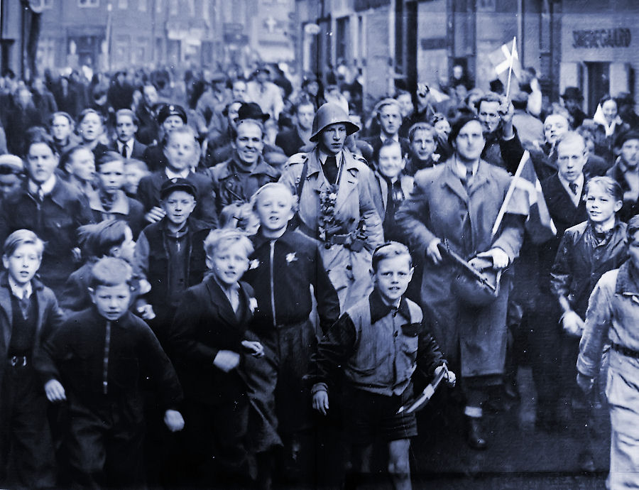Her er et billede fra befrielsen af Danmark den 4. maj 1945. Hele Danmark stod på den anden ende. Vi var ellevilde af glæde og vi hyldede vore helte og det var frihedskæmperne, der nu kunne træde åbent frem.