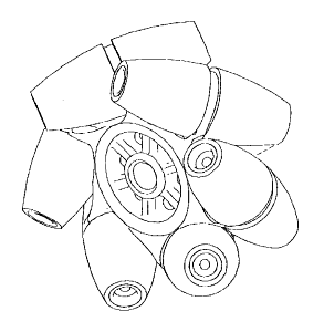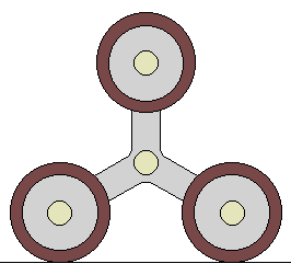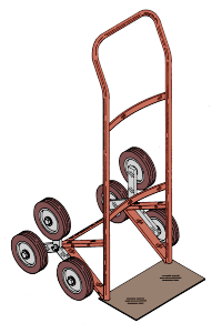 Pat.nr.us0d0336710 Dette hjul er konstrueret til at køre op og ned ad trapper. Tre almindelige fritroterende hjul er placeret på en trearmet holder, som selv frit kan rotere.