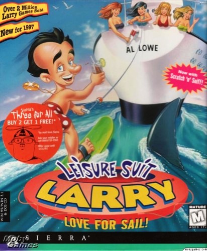 Dette spil der er flere i serien - er helt suverænt. Det er rimeligt svært. Der er helt afsindigt morsomme ting i spillet. Når man vinder noget her, ja så er det værd at glo på. Det tager tid at finde ud af, at man skal tage alt tøjet af - tage en sort g-strengs trusse på, stikke en strudsefjer i rumpen og sætte en paryk med skulderlangt lyst hår på hovedet og så lege man er stripper i Los Angeles dyreste natklub og gå på scenen og vinde førstepræmien og få adgang til elevatoren til pent-house lejligheden på toppen af skyskraberen. Du må simpelthen møde: CHARLOTTE BARBARA JO BIMBO CAPTAIN THIGH ANNALISA GAMBOZINNI Det kræver en let sexfikseret sykregen tankegang overhovedet, at være med i dette spil og nå til enden. OPGAVE: HVAD BETYDER SYKREGEN? HINT: PRØV BAGFRA! SPILLET KOM FREM I 1980ERNE OG BRAGEDE BARE DER-UD-AF OG DET BRAGER STADIGVÆK. LEISURE SUIT - BETYDER FRITIDS-JAKKE-SÆT. |