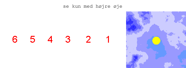 Den blinde pletHold dig for det ene øje. Langsomt skal du fokusere, et efter et, på tallene fra 1 til 6, og tilbage igen fra 6 til 1. Under hele turen skal du lægge mærke til solen i udkanten af dit synsfelt. For nogle af tallene forsvinder den!!!