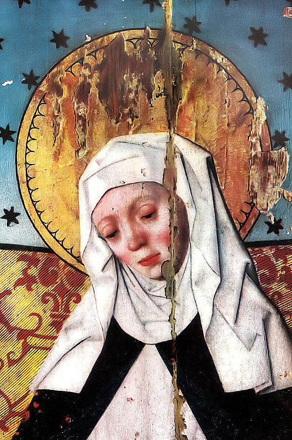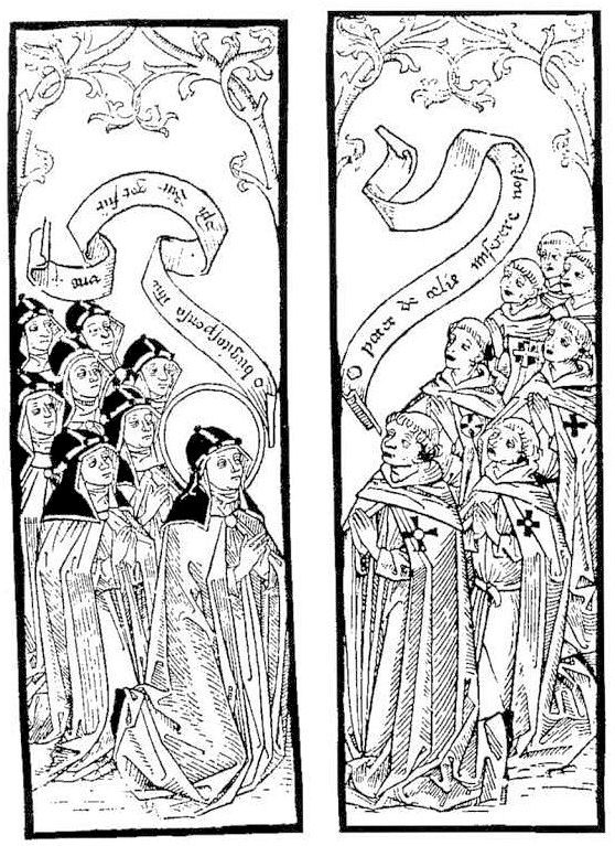 Maleri på et træstykke af Den hellige Birgitta. Hun udnævnte sig selv til Kristi brud og talerør. Det er næppe vanskeligt at forestille sig, hvad en psykolog kan få ud af det her åndelige massegifteri af nonner med Jesus. Birgitta var født i 1303 - samme år som Bonifatius VIII dør og hørte på både mødrene og fædrene side til de fornemste (fornem og fornem, skal vi ikke bare sige eliten af besiddende og magtfulde) slægter i Sverige. Allerede som et barn, kun 13 år gammel, blev hun gift med en svensk stormand (også en besiddende og magtfuld gut). Det fortælles at hun blev en lykkelig hustru og mor til 4 drenge og 4 piger. Hun blev snart kendt for sin fromhed og for at hun var god mod de fattige og de syge. Allerede som barn var hun synsk blev det fortalt. Hun havde set den hellige jomfru og den korsfæstede selv. Efter sin mands død trak hun sig tilbage fra omverdenen for at føre et strengt asketisk liv og nu begyndte hun ofte at falde i ekstase. Under sådanne ekstaser antog hendes oplevelser skikkelse af guddommelige åbenbaringer - lige som Paulus sagde han havde oplevet det, så fænomenet var jo velkendt. Disse såkaldte "åbenbaringer" nedskrev hun selv på svensk eller dikterede dem til en sekretær, hvorefter hendes skriftefædre oversatte dem til latin, for at de også skulle komme andre til gode. Det ses heraf at Birgitta har haft en uddannelse bag sig - som det kun var de færreste forundt. Hun kunne læse og skrive og havde midler til at holde sekretær og få sine åbenbaringer mangfolddigjort. Hvad står der så i disse "åbenbaringer". Jo, nogle gengiver enkefruens ekstatiske oplevelser, mens andre nærmest kan betragtes som en litterær form for Birgittas meddelelser eller for skriftefædrenes bearbejdelse. "Åbenbaringerne" viser dog at Birgitta havde en skarp iagttagelsesevne, en glødende fantasi, en moralsk nidkærhed og en oprigtig fromhed. Det hele samlede sig om den korsfæstede og betragtninger over ham. Til forskel fra hendes samtidige tyske mystikere (dem kommer vi til) - men i lighed med Det Gamle Testamentes profeter - følte hun sig kaldet til at virke for at reformere både kirken og samfundslivet. Som "Kristi brud og talerør" - hun havde ingen problemer med at fastsætte sin egen autoritet - udtalte hun strenge straffedomme mod de hovmodige og havesyge svenske stormænd og mod kongen Mogens Eriksson ("Smek"), som "var hildet i mangen syndens garn", mod præsternes fordærvelse og mod de avignonske paver, som hun indtrængende formanede til at vende tilbage til Rom og forbedre kirken. Hun angreb den enkelte pave. Således lader hun Kristus tale til Clemens VI: "Din stortalende tunge skal tie i dig; det navn, som du har udråbt på jorden, skal være i glemsel og vanære for mit og mine helliges åsyn ... Ej heller skal det glemmes, hvorledes begærlighed og forfængelighed i din tid voksede og trivedes i kirken, og at du kunne have rettet og forbedret meget deraf; men du, kødets elsker, ville ikke." På den anden side anerkendte hun dog, at Gud havde givet Peters efterfølger fuldmagt til at binde og løse, hvorfor selv en ugudelig pave har krav på lydighed. Det var altid kun livet, hun ville have reformeret, ikke kirkens forfatning eller lære, som Birgitta i et og alt godkendte. Man kan derfor ikke sige eller betragte Birgitta som en egentlig reformator og det ville være forkert at betragte hende son en forløber for Luther, men hun gav udtryk for den offentlige mening, når hun kaldte kirken til orden. Hun troede også, eller sådan sagde hun det i hvert tilfælde, at selve Frelseren havde åbenbaret sig for hende og indgivet hende reglen for en ny orden, som hun skulle grundlægge. Det er bestemt det mest bemærkelsesværdige og interessante ved enkefruen Birgitta. Sådan en orden kan man ikke bare lave. Det kræver en pavelig stadfæstelse. Derfor rejser hun i jubelåret 1350 til Rom - jo, i 1350 - egentlig skulle jubelåret fejres hvert 100 år, "men af hensyn til menneskelivets korthed" eller måske rettere den pavelige pengekasses fornødenheder, havde senere paver nedsat denne tidsfrist til 50, 33 og til sidst 25 år - for at opnå pavens stadfæstelse, "hvor der er en genvej til himlen på grund af den aflad, som de hellige paver har fortjent ved deres bønner." Her í Rom levede Birgitta resten af sit liv, kun afbrudt af enkelt pilgrimsrejse til Jerusalem. 1377 døde hun. Nogle år efter blev hendes orden stadfæstet af paven, og Birgitta selv helgenkronet. Det var en ejendommelig orden, der nu skød op. Birgittas ordensregler betød, at der skulle indrettes dobbeltklostre, idet der i hvert kloster skulle være 60 nonner og 25 munke, hvoraf de 13 skulle være præster, hvilket svarer til de 12 apostle og Paulus (Paulus ville gerne udnævne sig selv som apostel, men han havde aldrig vandret sammen med og fulgt Jesus, han havde kun ifølge egne beretninger oplevet Jesus, som en åbenbaring og det rakte jo ikke til en apostelstatus). Munkene og Nonnerne havde hver sin bygning med en mur imellem og måtte ikke have noget samkvem med hinanden. I den fælles klosterkirke skulle der være to kor, et forneden for præsterne og et foroven for nonnerne. I spidsen for hvert kloster stod en Abbedisse som stedfortræder for den hellige jomfru, til hvem ordenen var indviet. Det var med andre ord en Maria-orden. Nonnerne var især optaget af andagtsøvelser og håndarbejde; præsterne skulle læse messe, afskrive bøger og om søndagen prædike på modersmålet; lægbrødre og lægsøstre udførte de fornødne legemlige arbejde. Maria-ordenen havde også "tertiarie" - ordet kommer af tertius ordo, hvilket betyder den tredje orden. Der var mennesker, som ikke ville bryde med deres familie, ægteskab eller borgerlige kaldsgerning. De skulle leve et fromt og afholdende, halvt munkagtigt liv. Det var mænd og kvinder, der var blevet grebet af Kristi fattige liv og som søgte støtte hos ordenen uden ligefrem at slutte sig til den. Denne ordnin