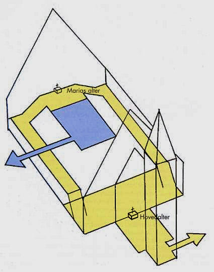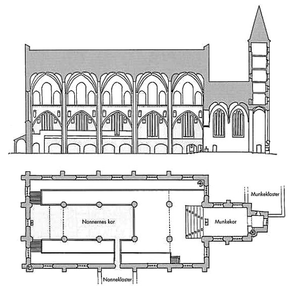| Nederst en mere detaljeret rekonstruktion af nonnernes hævede kor, hvortil de havde direkte adgang til østfløjens sovesal i nonneklosteret. Længst mod øst i koret stod et alter indviet til Jomfru Maria adskilt fra resten af koret med et jerngitter. Hertil havde præsterne adgang via en hævet omgang langs væggen, der gik under nonnernes gang mellem klosteret og kirken. På denne måde kunne kønnene holdes ærbødigt og sikkert adskilt.