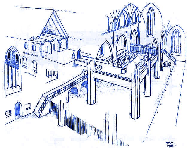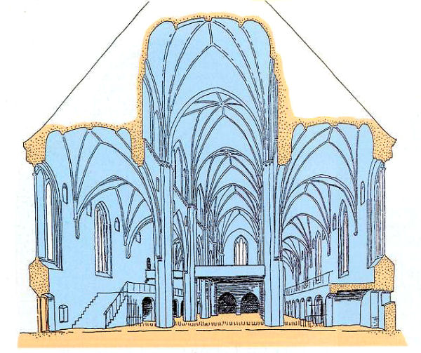 | Et blik ind i Mariager Klosterkirke, som man mener den har set ud i perioden 1480-1588. Her en plan over kirken set nordfra og oppefra. til højre kirken set inde fra munkenes kor i kirkens vestende ned mod nonnernes hævede kor. |