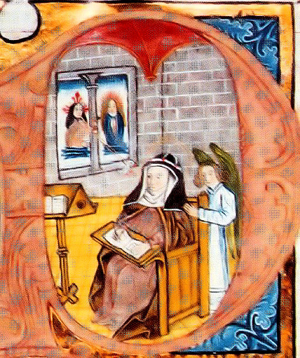 | Den hellige Birgitta nedskriver reglerne for sin klosterorden, som de dikteres hende af en engel sendt fra Gud. Hun er selvfølgelig selv iklædt den dragt, som også hendes nonner skulle bære: Grå dragt, hvidt hovedklæde og sort slør. Miniature i birgittinsk regelbog fra klosteret i Dendermonde. Hessische Landes- und Hochschulbibliothek, Darmstadt. Er det ikke tankevækkende, at man for lidt over 600 år siden troede fuldt og fast på, at der sådan kom engle og dikterede klosterordensregler. Det blev tilsyneladende købt råt. I 1911 opstod en ny gren af birgittinersøstre i Rom ved den svenske konvertit Elisabeth Hesselblad (1870-1957), som har fået klostre i bl.a. Indien og Mexico.