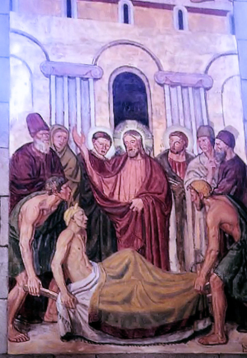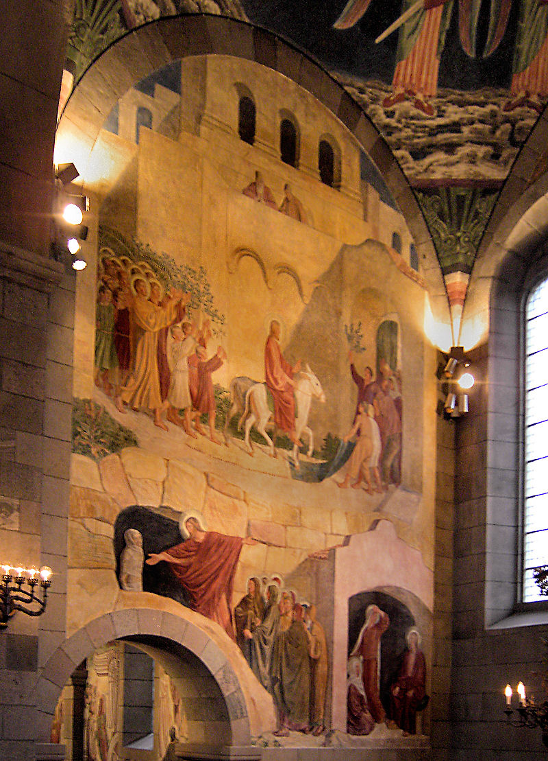 Her har vi så den sidste nadver. Jesus i midten med hævet højre hånd, der indstifter det- te mindemåltid omgivet af sine 12 disciple - ikke alle er lige trofaste, Peter (det må være ham med koslikket til højre for Jesus) der fornægtede ham 3 gange inden hanen gol, de andre kunne ikke holde sig vågne efter måltidet og faldt i søvn i Gethsemane have, hvor Jesus nok kunne have trængt til lidt kammeratlig opbakning. I forgrunden sidder forræderen Judas Iskariot med en pengepung med de 30 sølvpenge, han har solgt Jesus for. Jesus krammer sin yndlingsdiscipel lille Thomas til sig. Det var Thomas der ikke troede på, at det var den genopstandne Jesus han havde foran sig og først lod sig overbevise, da Jesus bad ham stikke fingrene ind i spydhullet i sin side og gennem naglehullerne i hænderne for at han kunne blive tvivlen kvit. Jeg har tit som barn tænkt på, hvordan den scene skulle have udspillet sig, hvis nu Jesus var blevet halshugget. Paulus er ikke med her. På det tidspunkt hed han Saulus og forfulgte Jesus. Der er i øvrigt lammesteg på bordet, skuebrød og vin. Kan vi ikke få det til nadveren i stedet for et lille bæger fimset kirsebærvin og et lille stykke ugæret brød med et kors på, der smager af sygevat og trækpapir. De første kristne i Jerusalem under Jesus´ broder Jakobs ledelse indtog et sådant fælles mindemåltid med lammesteg og det hele og det blev man ved i lang tid herefter. Det er først da kirken bliver katolsk (almindelig), at man kraftigt nedskærer på budgettet. En lammekotelet ville være fint og så en god kraftig rødvin.