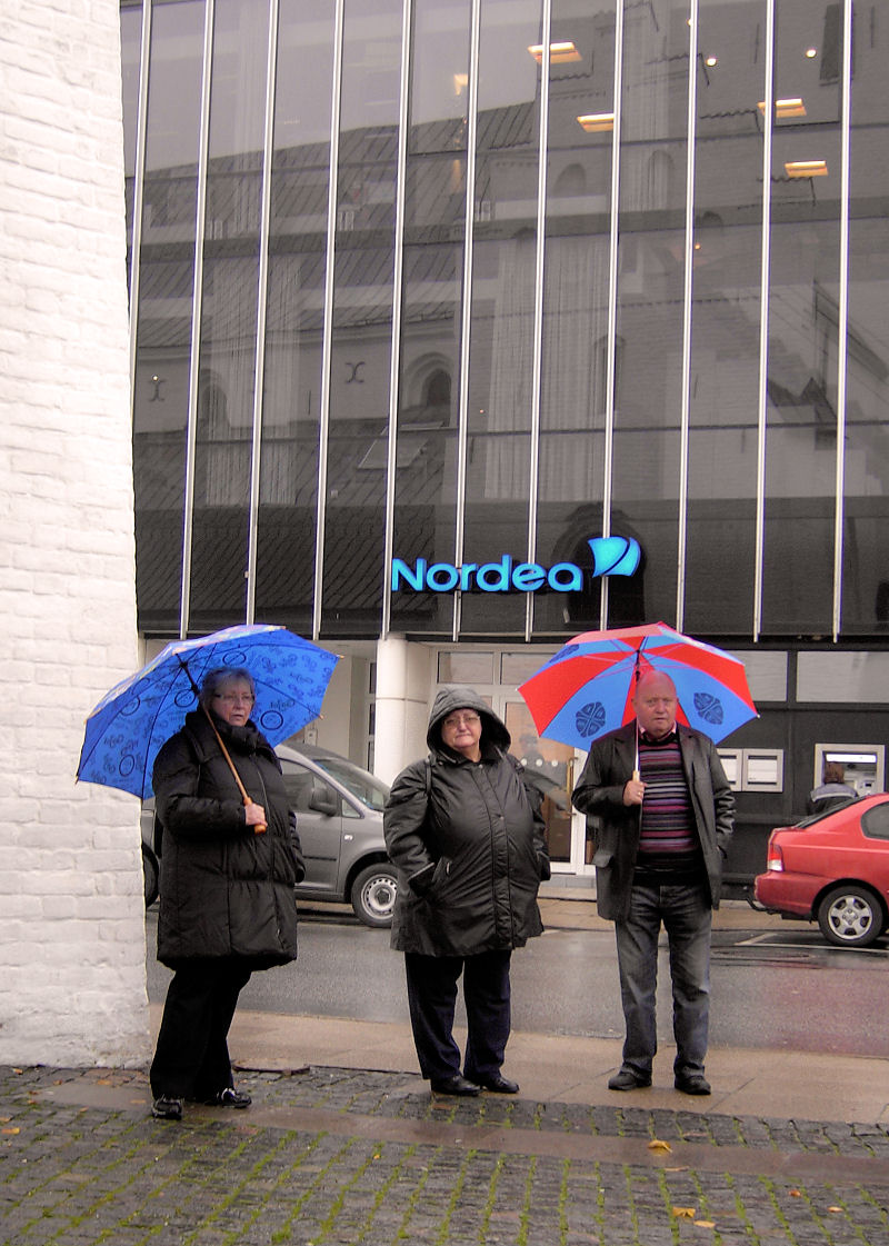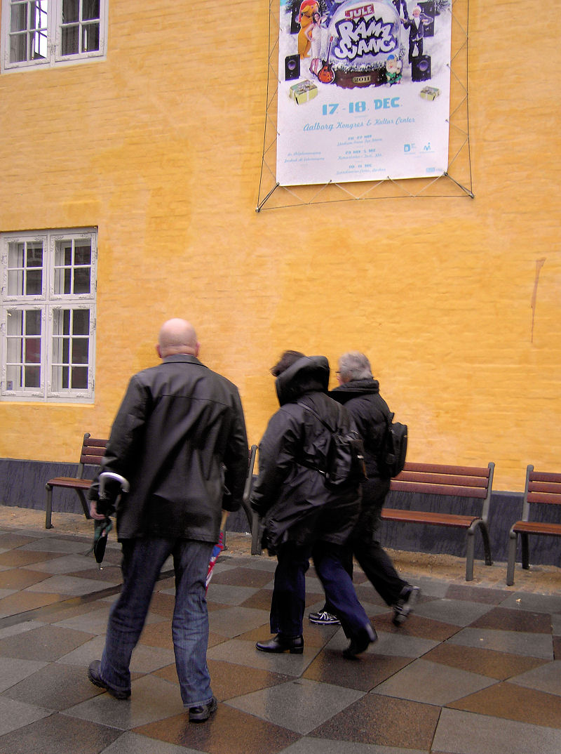Vore venner passer et hus for et familiemedlem i Hobro, der sammen med sin mand skal besøge deres søn i Luxemburg. Derfor har vi aftalt at vi laver lidt sammen her i grænse- landet mellem nord- og Midtjylland. De har lige kørt familien til lufthavnen i Ålborg. Vi af- tales at mødes ved nedgangen til Friis varehus nede ved Limfjordskajen. Nu laver vi en lille byvandring. Vejret er trist og regnfuldt. Vi må tilbage efter paraplyerne.
