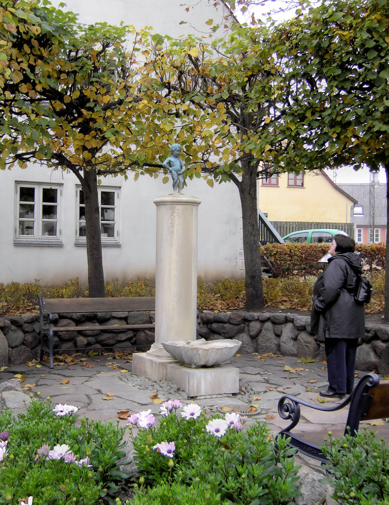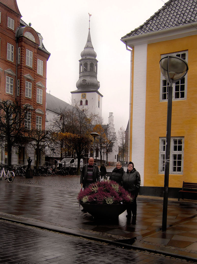 "Stil Jer lige op ved blomsterkummen, så jeg kan tage et billede af Jer med Ålborgs domkirke Budolfi i baggrunden!" - "Hvad skal vi?" - "Gør nu som jeg siger!" Her er resultatet. Det er da rimeligt. Sådan kunne man nu godt have pyntet blomsterbrønden ude ved kroen.