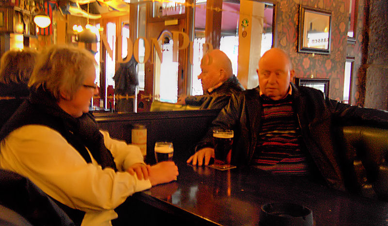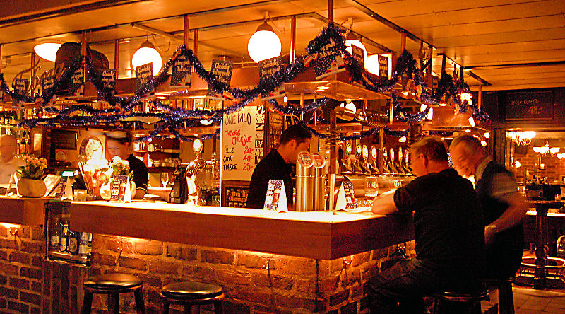 Vi sludrer løs og hygger os og øllet er rigtigt godt. Vi beder om, at når vi ikke kan få sneøl, så må man da hoste op med en sneølsgave til vor fødselar. Vi har ved tidligere lejligheder fået emblemer med indlagte lysdioder og jeg ved ikke hvad. "Det bliver svært siger tjeneren", men så kommer han alligevel og forærer fødselaren sit eget sneølsjulemandshår. Det er fedt nok, man ligner en der er blev gråhåret ved en pludselig bombeeksplosion, med det på hovedet. Fødselaren nægter at lade sig fotografere med det på.