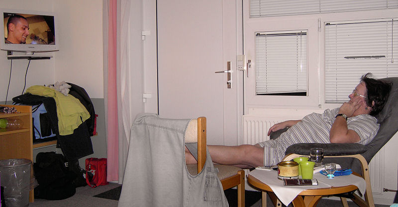 Vi tager hjem til kroen og får slået stængerne op, men lidt efter kommer vore venner. De synes lige så godt de kunne tage ud til os. Vi henter store øl ovre i krostuen og hygger os et par timer på værelset.