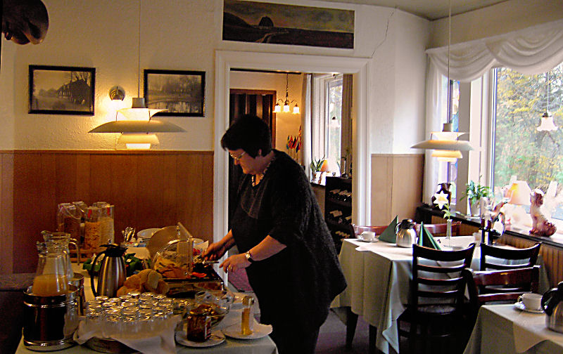Morgenmad på kroen. Jeg er til havregryn med mælk og en kop the - så alt det andet har ikke min interesse. Min viv elsker sådanne morgenmadsbufetter og får spist alt for meget.
