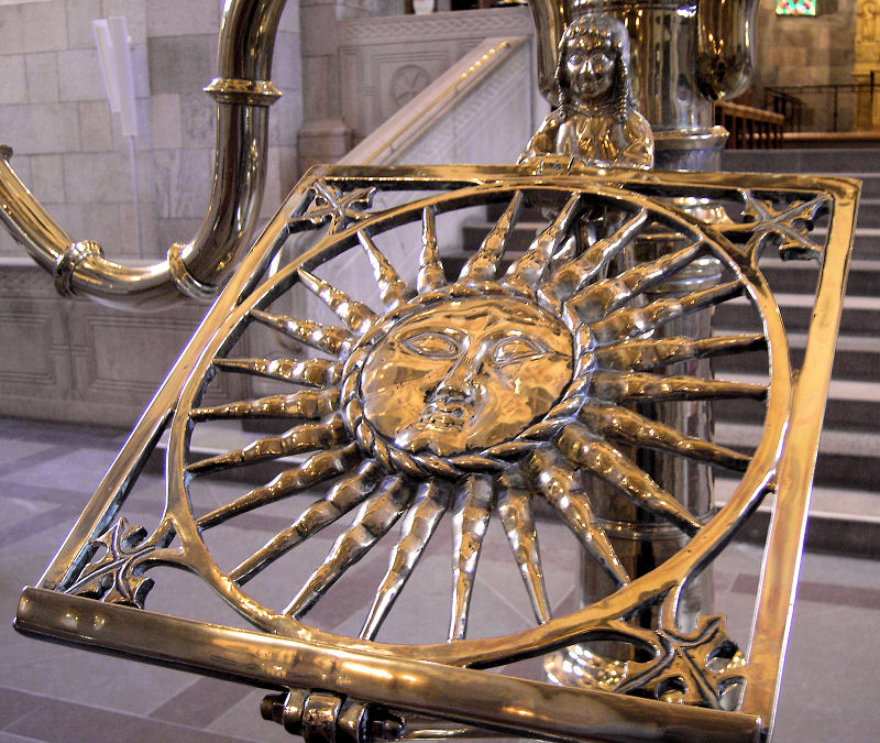 Detalje fra den store lysestage. Før elektriciteten havde man en kæmpelysestage så præsten kunne se at læse i den mørke kirke. Det er stykke flot kunsthåndværk. Her er læsepulten med solmotiv. "... Og med Guds sol udgår fra øst en himmelsk glans på jord, et glimt fra para- disets kyst, hvor livets abild gror ...". Hvem kan ikke sin Ingemann. Abild betyder - det ved du sikkert ikke - et skovæble. Det er livets træ med æblerne der henvises til i salmen: "I østen stiger solen op." Der er to træer i paradis - et med kundskabsæbler og et med æbler, der giver evigt liv. Livets træ.