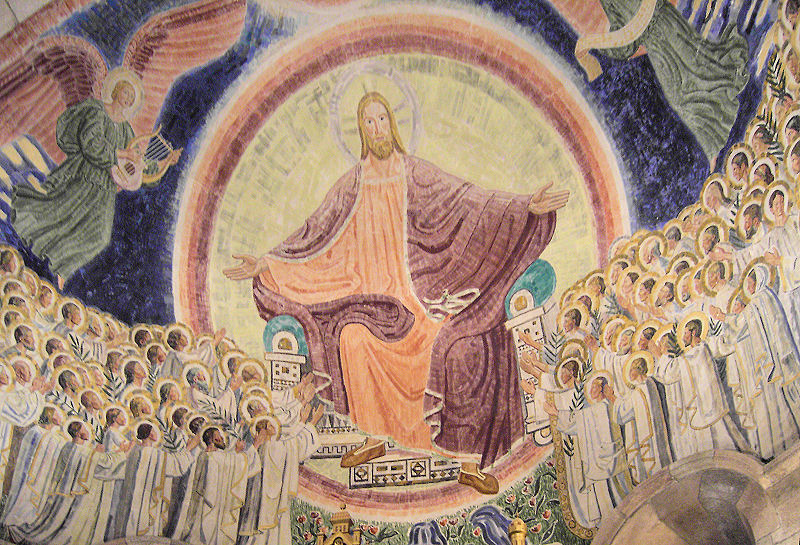 Så er det blevet dommedag. Det er den store hvide flok du ser. Jehovas vidner tror det er dem der skal stå her med palmegrene. Det har de regnet ud ved at læse Johannes Åben- baring, som man nok skal afholde sig fra at forsøge at fortolke. Teksten er simpelthen det rene vås og vrøvl. Det er en såkaldt apokalypse - et skrift der fortæller hvad der skal ske ud i fremtiden. Det er skrevet i en speciel stilart, hvor et fortælleelement er metaforer - det vil sige billedlige fremstillinger - her dog holdt i mystiske billeder, der skal tolkes. Den der har forstand han kan forstå det - siges det manende i teksten flere gange. Så må man jo sige, at man kan forstå det - selv om man ikke kan begribe, hvad der menes konkret - ligesom i eventyret om Kejserens nye klæder, hvor man kan se, at der ikke er noget tøj, men det skal man jo ikke lige have sagt..