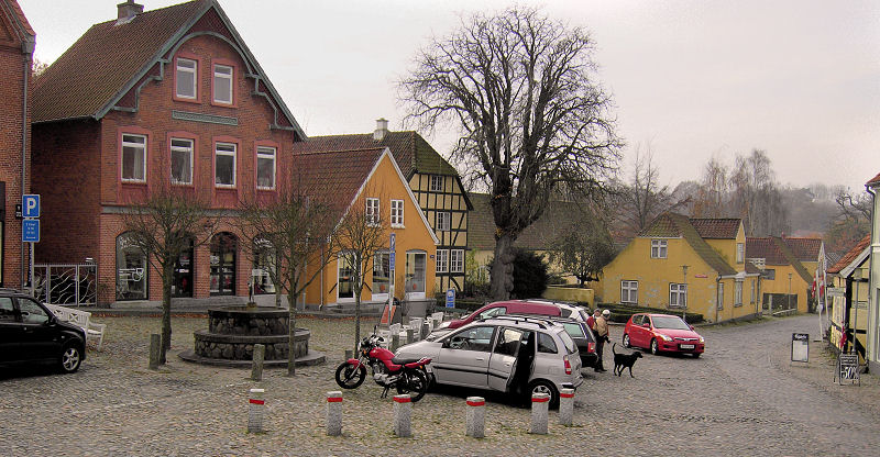 Der står en berømt 100-års eg her på pladsen med knudret stamme. Det er et hyggeligt torv og man har tænkt på siddepladser. Nu er vi her uden for turistsæsonen - så det er småt med mennesker på torvet.