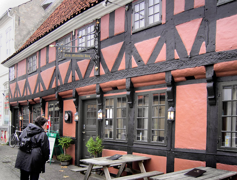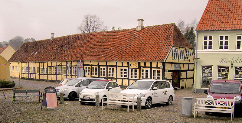 Så er vi landet på bytorvet i Mariager. Vi har rimeligt vejr. Vi kan se, at vi er i en gammel bymidte. Her er ældre bygninger med bindingsværk. Det hele er brostensbelagt.