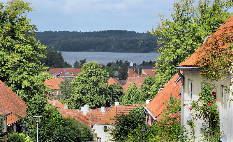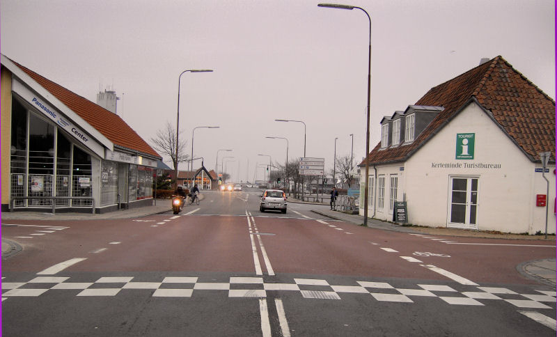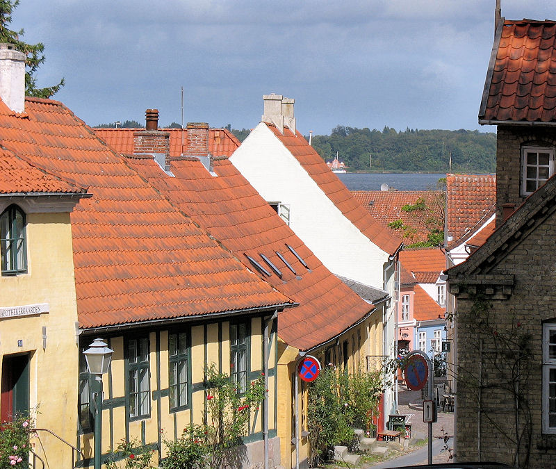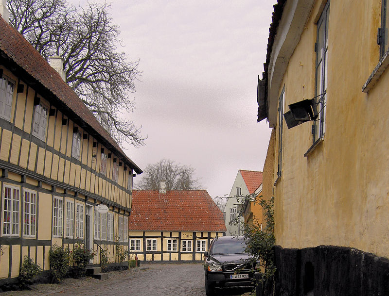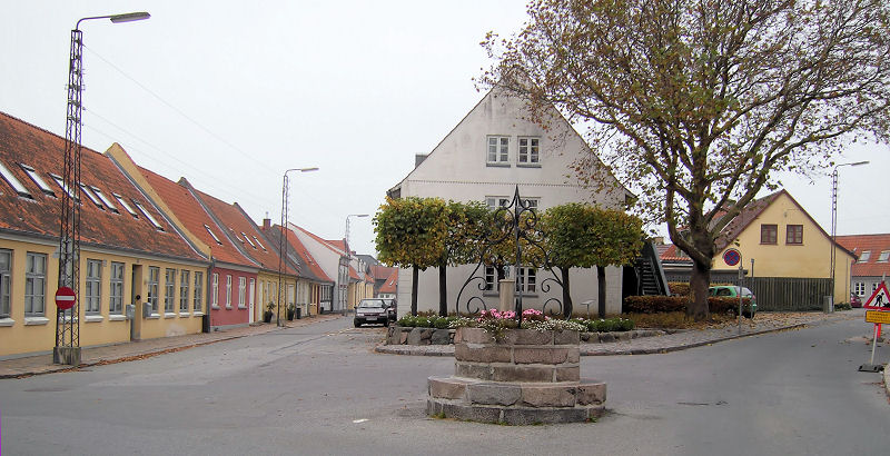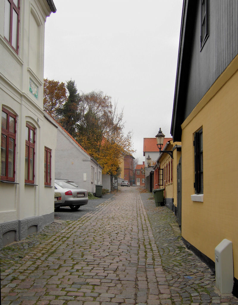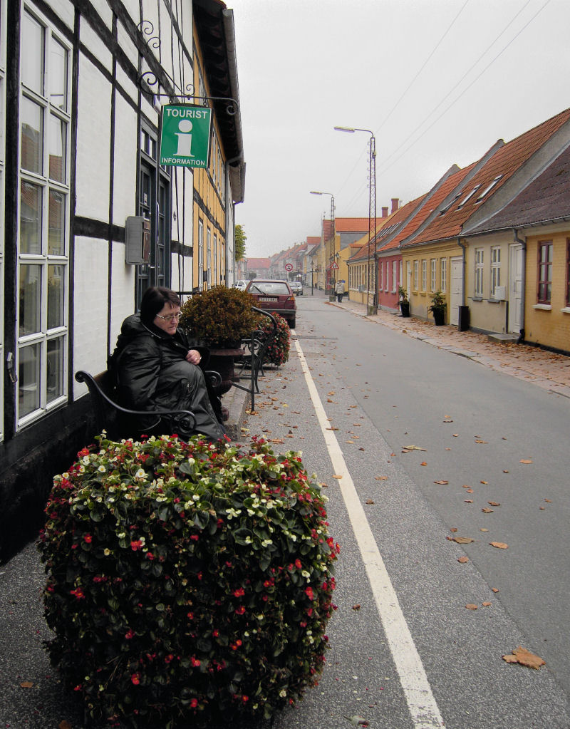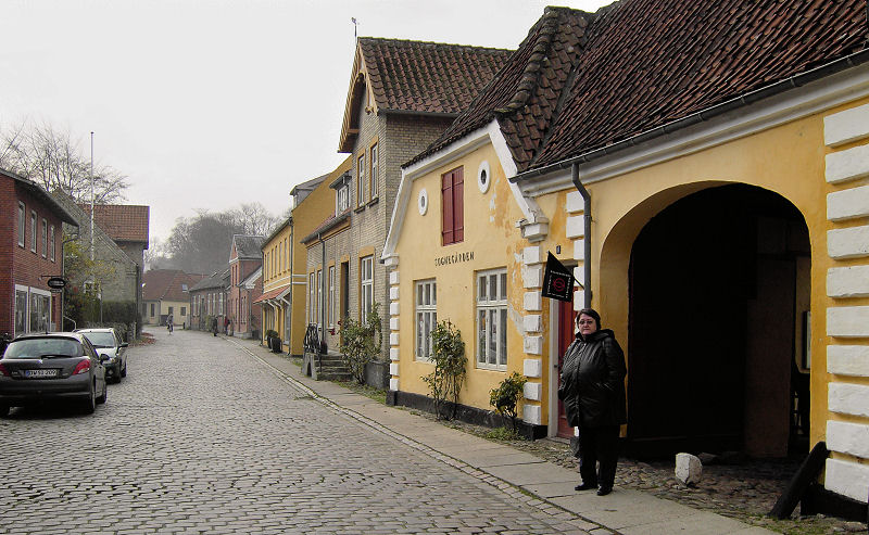 Vi kigger lige ned ad Kirkestræde. Min kære viv har taget opstilling lige ved Sognegården.
