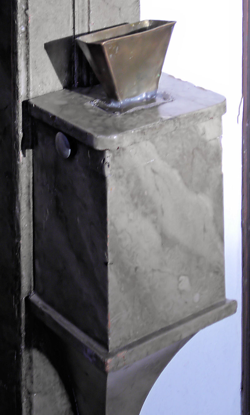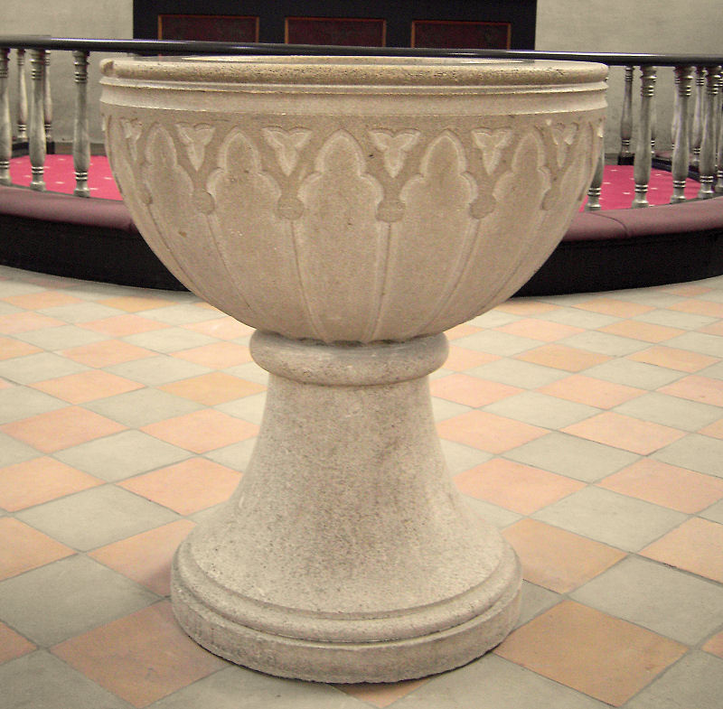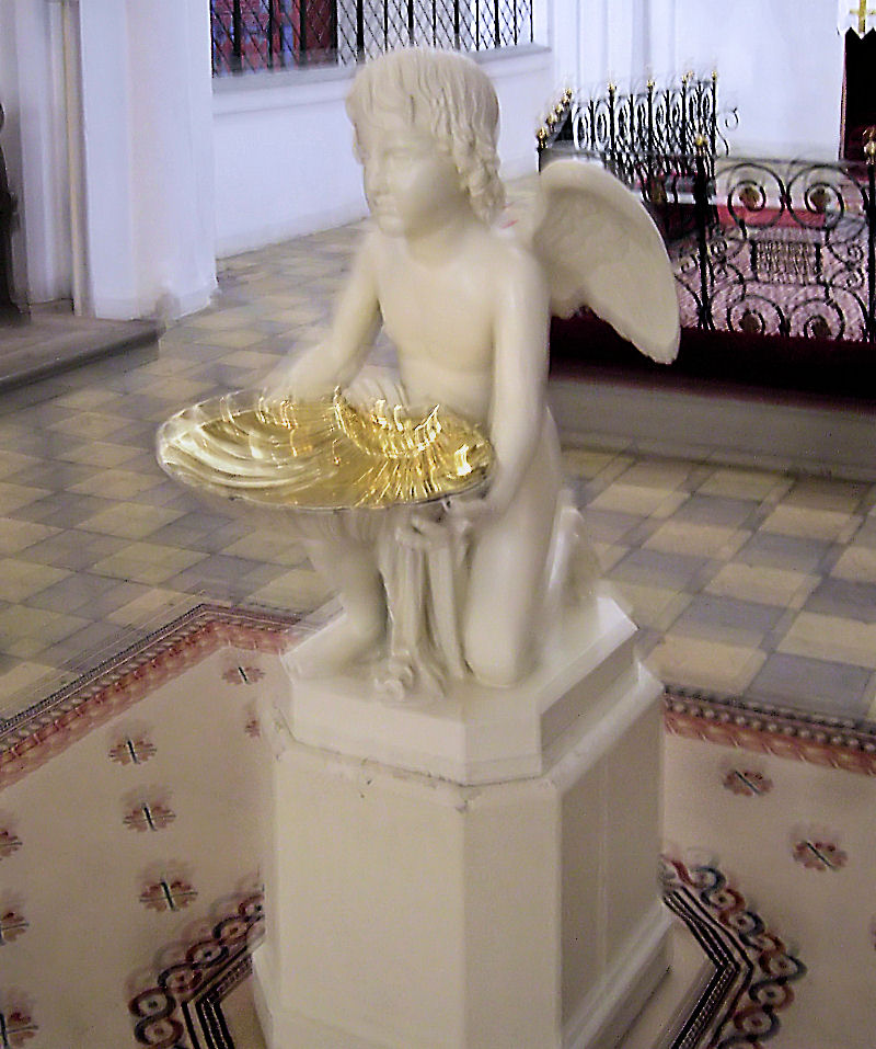 Det her er en noget speciel døbefont. En knælende engel der holder en muslingeskal. Det er en zinkkopi af H.W. Bissens marmororiginal i Middelfart kirke - den er fra 1844.