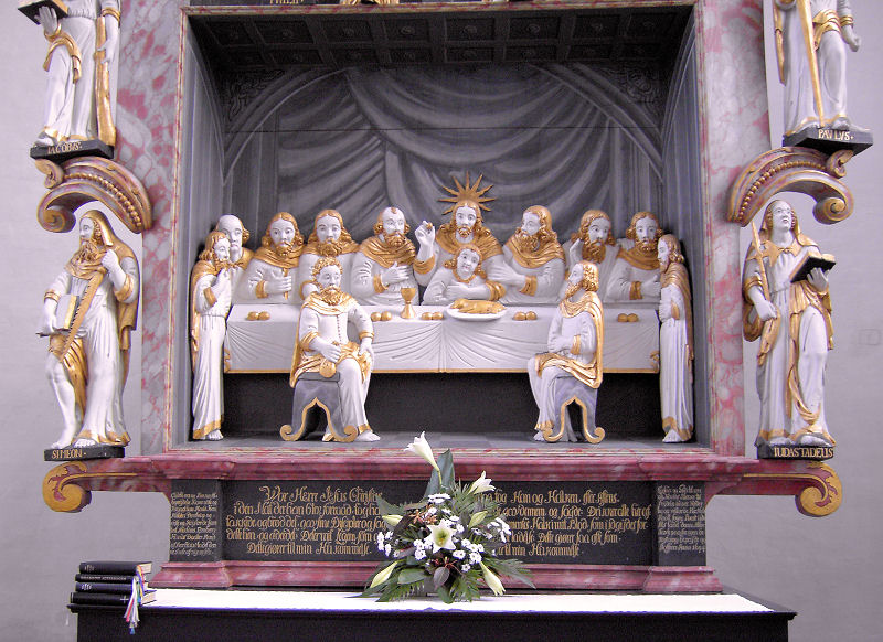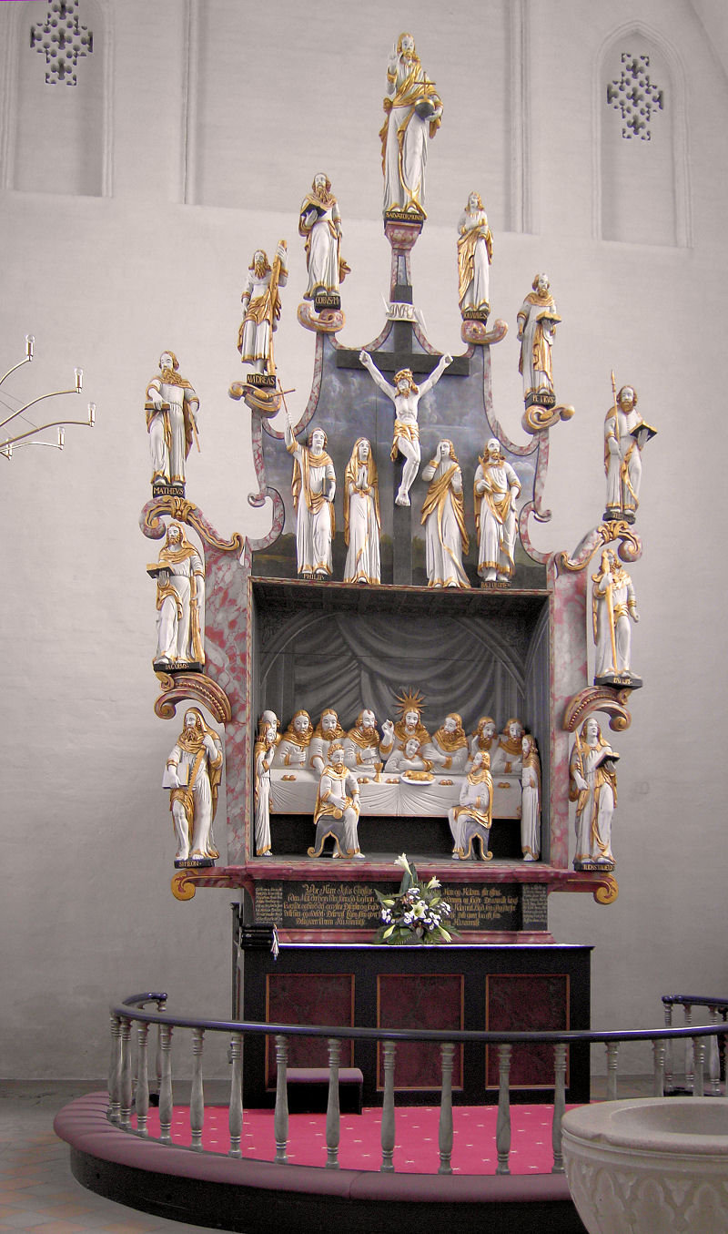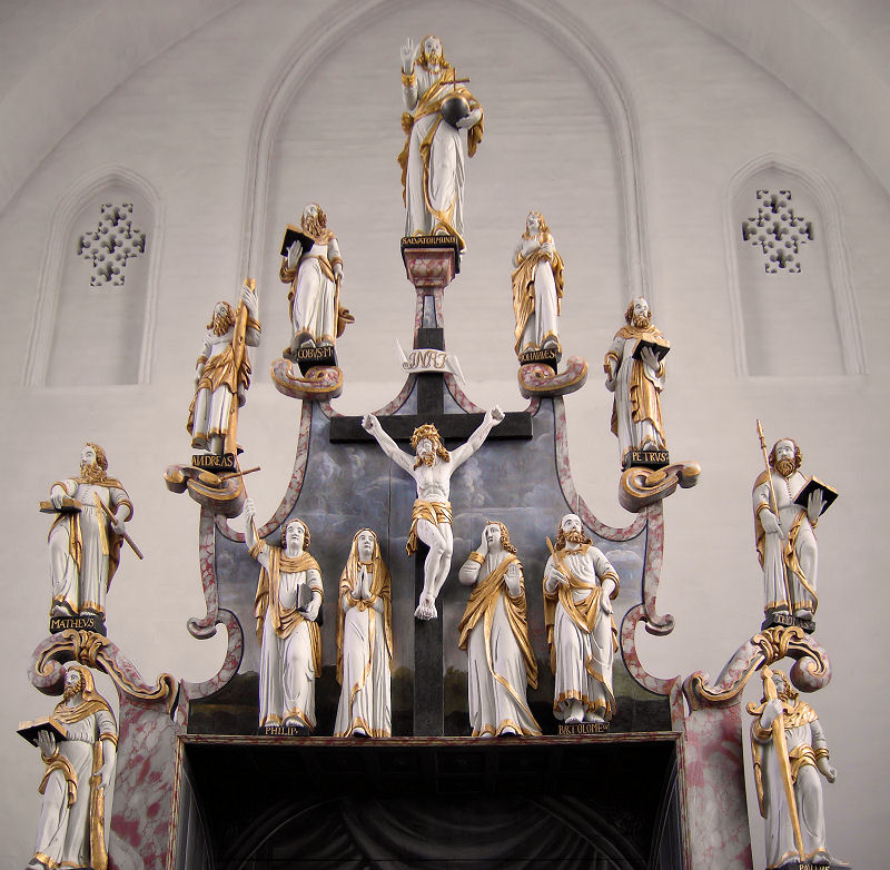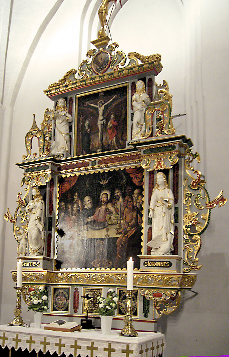 Her ved alteret med det foranliggende rækværk og knæfald finder vi altertavlen. Der er ikke noget altersølv på alteret (det er gemt sikkert væk). På alteret en blomsterdekora- tion. Jeg render lidt rundt for at finde en position, hvor jeg tage billeder fra. Det er svært for jeg har det princip, at jeg ikke betræder ligstenene, der ligger i gulvet. De er slidte nok i forvejen og man "træder ikke på en, der ligger ned". Denne her tavle er helt unik kan jeg se, det er billedskærerarbejde i super-klasse. Den hvide bemaling med guldbelæg- ning er yderst elegant. Det er barok - i begyndelsen var tavlen ikke bemalet. Nogen vil nok finde tavlen noget svulstig, men jeg synes om den. Hele sceneriet er bygget op omkring krucifikset. Alle figurerne har fået navn. Peter har fået nøglerne til paradis. De to Mariaer, Jesu mor og Magdalene står ved korsets fod. De mest fortjenstfulde af apostlene er også kommet med.