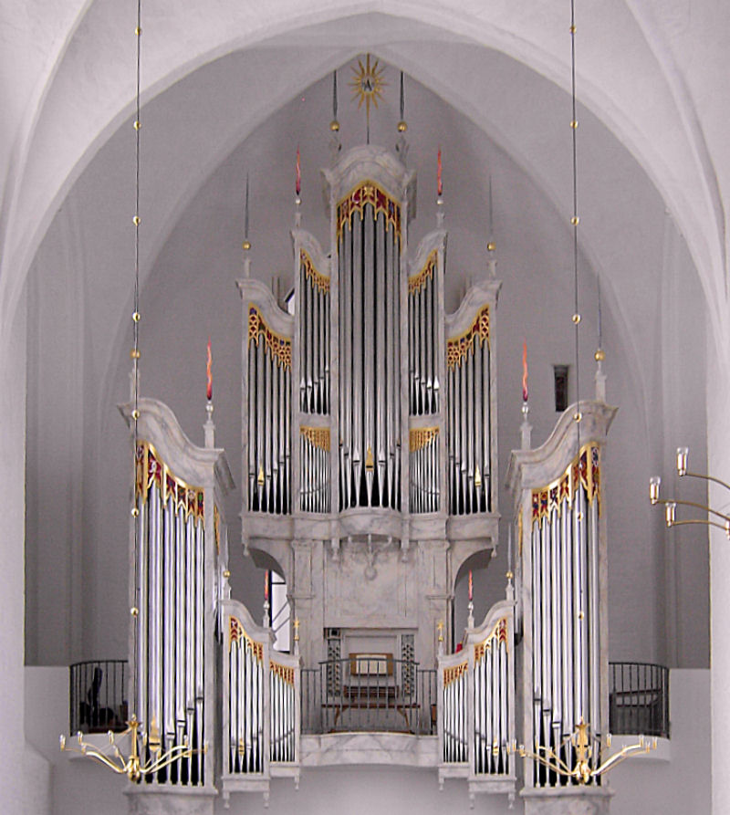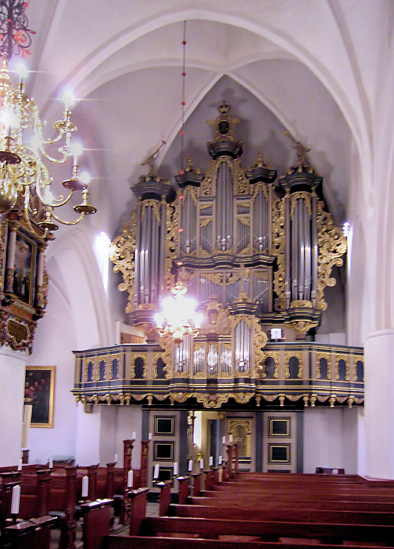Orglets facade er i barokstil, men lad dig ikke narre. Orglet er nemlig langt yngre fra 1938. Kirketjeneren har fået sat lys i alle stagerne.