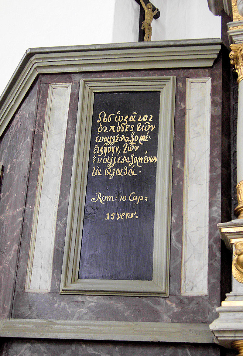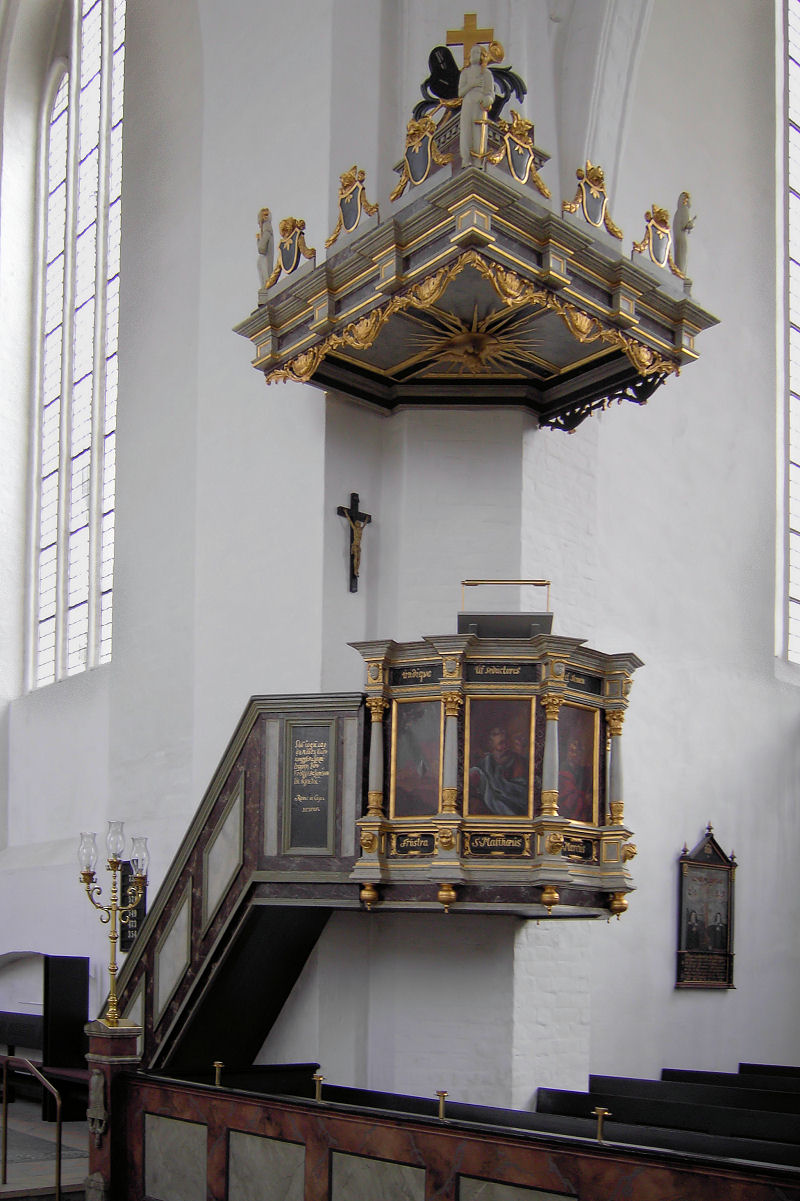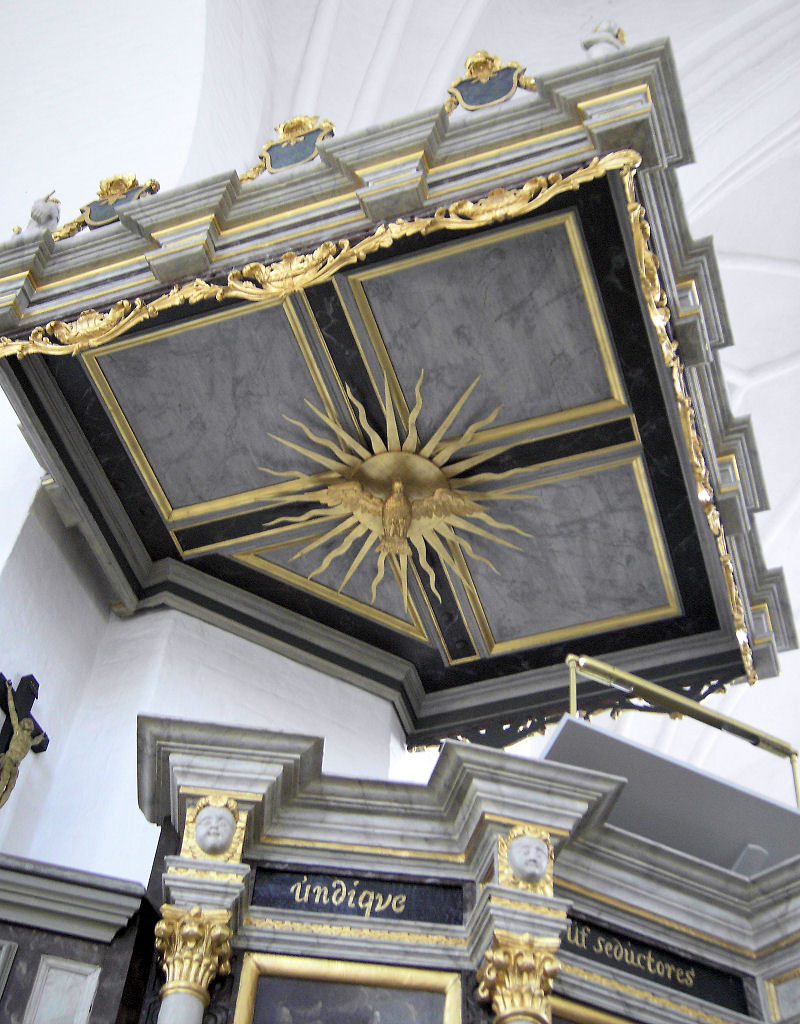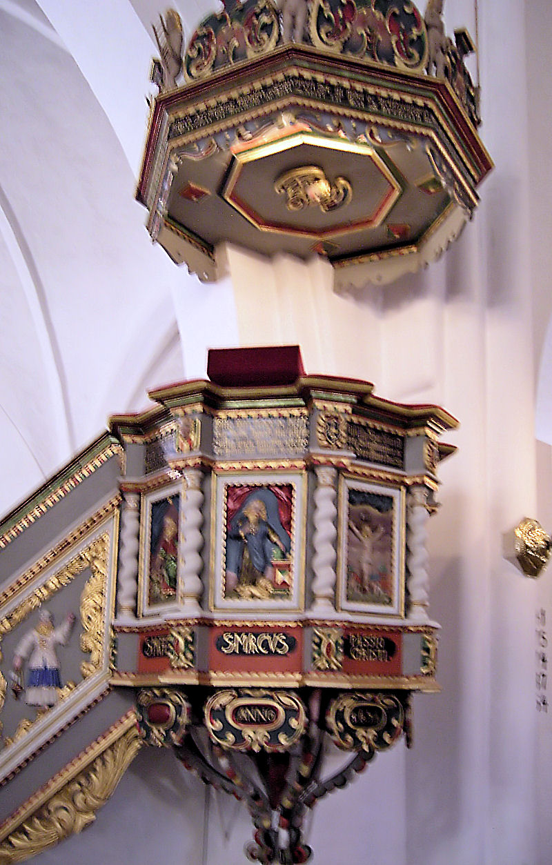Det inventar vi møder i kirken er barok. Det er farvestrålende, men også lidt svulstigt. Her er det prædikestolen med lydhimmel fra 1676.