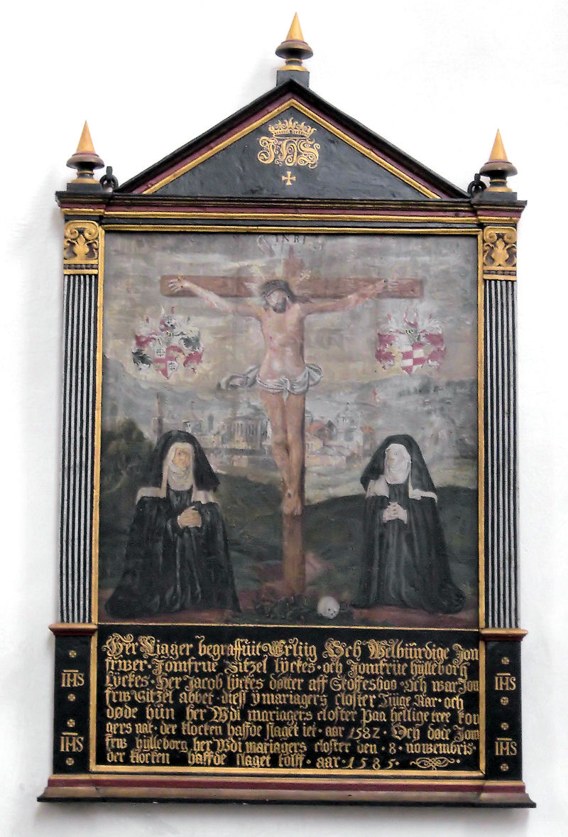 | Stygge Krumpens ligsten i Mariager klosterkirke. | Foruden familien Rosenkrantz vides bl.a. slægterne Krumpen og Lykke at have støttet klosteret. Blandt de mest prominente begravelser i Mariager Klosterkirke står Børglums sidste katolske biskop Stygge Krumpen († 1551), der blev gravlagt i Krumpen-slægtens private kapel, hvorfra hans ligsten senere er flyttet hen til den nuværende placering i kirkens østende. Ved middelalderens slutning var Mariager Kloster både i godsøkonomisk og i religiøs henseende at regne for det største kloster i Østjylland. |