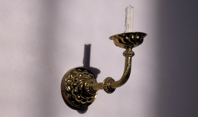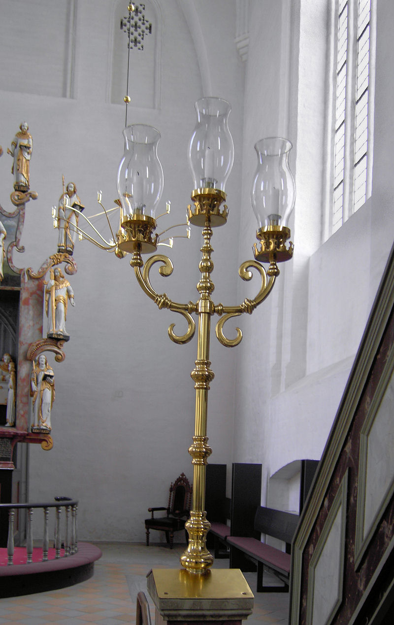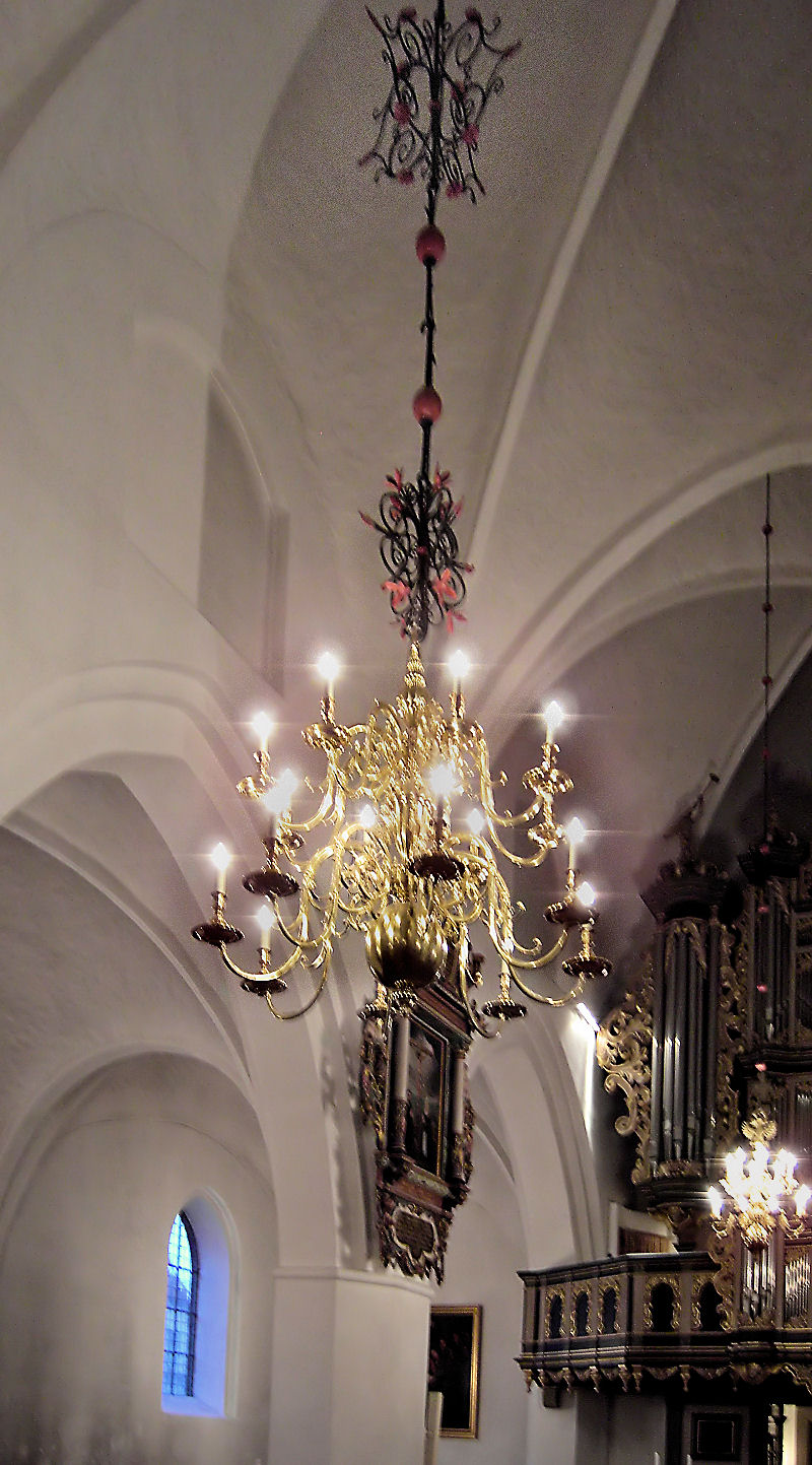 En smuk lysekrone. Godt for kirketjeneren, at han ikke skal sætte lys i stagerne.