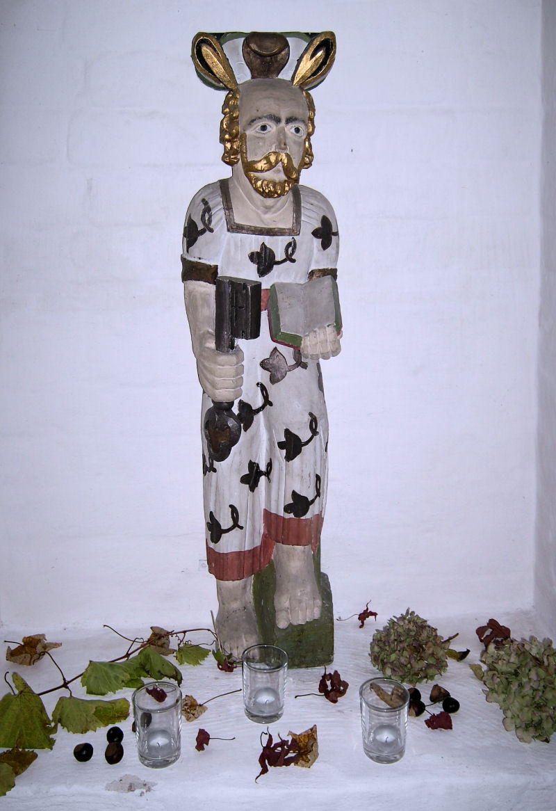 Helgenbillederne blev smidt ud af kirken. Om Mariadyrkelsen så ophørte fra den ene dag til den anden er nok lidt usikkert. Men pavestolens greb om kirken i Danmark var slut. Det eneste, der nu stod - og står - tilbage, er navnet på byens kirke: Sankt Laurentius. Som minde om dens oprindelse. Jeg er gået alene ind i kirken. Inge-Lis vil hellere se lidt på gågaden og trække lidt luft. Det undrer mig, at kirken er fuldt illumineret. Jeg ser kirketjeneren suse rundt og sætte lys i stager. Jeg hilser på ham. Han besvarer min hilsen og siger: "Vi fejrer Allehelgensaften kl. 17.00 ved en særlig gudstjeneste - jeg er ved at gøre klar og har lidt travlt". "Sig mig lige engang du kirkens tjener - afskaffede vi ikke det her med reformationen?". "Øh, bøh - det er jo en fest for de afdøde - for alle sjæle - det kan man da godt fejre! Det gør de jo også i U.S.A. med Halloween. Vi læser navnene op på alle de der er døde i årets løb". Jeg siger ikke noget, men tænker mit om monstre, døde der dukker op og udskårede græskarhoveder og monstrefilm.