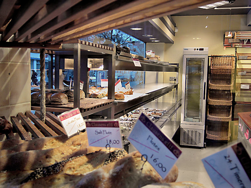 En bagerbutik. Brød er blevet dyrt og folk køber brød på tankstationer og supermarkeder der kan bage af mix-blandinger og derfor kan levere varmt brød. Denne udvikling har medført at over 600 bagere har måttet dreje nøglen gennem de sidste år. Jeg der stammer fra et bagerdynasti er selvfølgelig beskæmmet. Der er kommet meget nyt til, men jeg savner nu kryddere, gifler, rosenbrød, tvebakker, sigtebrød, surbrød og rasp i poser. Udvalget af flødekager er yderst begrænset i denne butik. Jeg har aldrig brudt mig om de kedelige tørkager, men de er jo lidt langtidsholdbare. Ikke engang et lille rosinbrød er der på hylderne.