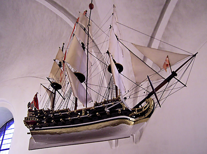 I det nordre sideskib finder jeg denne ophængte skibsmodel. Den er fra 1685. Den er blandt landets ældste og bærer navnet "Dannebrog". Der er også et årstal på den nemlig 1765, men det henviser blot til en restaurering. Navnet kan opfattes som et minde over 22 søfolk fra Kerteminde, der omkom sammen med Ivar Huitfeldt under slaget i Køge Bugt i 1710. Nu skal du høre om et helt andet slag: Der havde i umindelige tider hersket et særdeles spændt forhold mellem Danmark og Sverige. 1. juni 1657 erklærer kong Frederik III krig mod den svenske kong Karl 10. Gustav, der lå med størstedelen af sin hær i Vestpreussen. Men den var ventet, så det var en alt andet end uforberedt svensk hær, der nu rykkede mod Danmark. Kerteminde mærkede i første omgang ikke noget til krigshandlingerne. Og dog. Der var på forhånd lavet en indkvarteringsplan for et rytterregiment på 102 personer, der skulle indkvarteres og underholdes af byen. En ganske voldsom åreladning for det lille samfund.