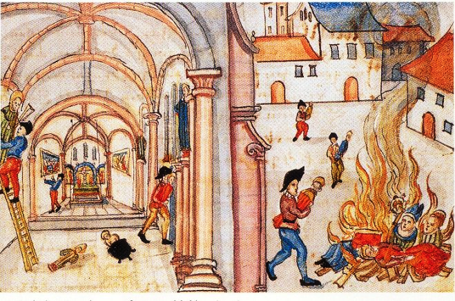 Billedstormerne Mange steder gik det voldsomt for sig, da man gjorde op med den katolske kirkes inventar. Altre blev fjernet og ofte hugget til pindebrænde. Det samme gjorde sig gældende for helgenfigurerne. Vi ved ikke, hvad der skete i Kerteminde. Men i alle fald blev helgenaltrene fjernet. Til gengæld blev Kristi kiste ikke rørt. Svært har det vel egentlig også været pludselig at skulle smide noget ud, som har haft en central placering i det enkelte menneskes religiøse univers. Biskoppen over Fyn, Jacob Madsen, foretog i perioden 1588-1604 en lang række visitatsrejser rundt om i sit stift. I adskillige kirker fandt han spor efter katolikkerne, hvilket gjorde ham rasende. Og den enkelte kirke fik påbud om omgående at skaffe disse spor af vejen. Han kaldte dem ligefrem "De gamle skarns forgiftede, slemme og unyttige tavler". I Skt. Laurentius kirke opdagede han, at både monstransen og Kristus i kisten stadig fandtes. Præsten måtte højt og helligt love at få dem bortskaffet. Da biskoppen året efter kom tilbage, var dette endnu ikke sket. Men kirken gemte Kristus i kisten - og det var først under et større arbejde i kirken i 1845 at den gamle, katolske kiste med den lidende Jesus blev fjernet. Og anbragt på Nationalmuseet i København. Billedet stammer fra en tysk bog om reformationen fra slutningen af 1500-tallet ca. 1580