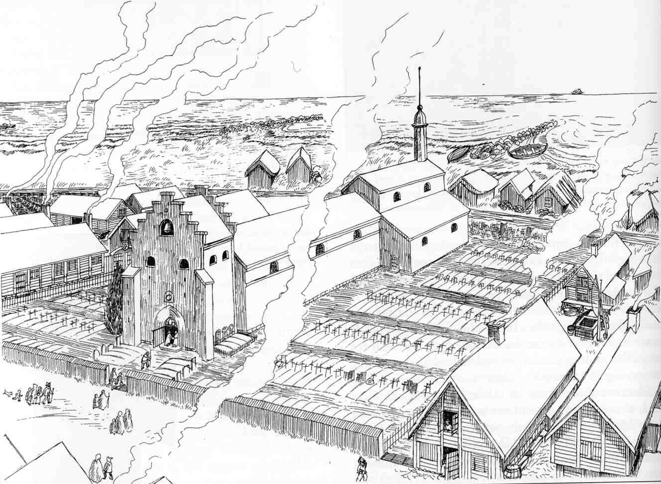 Som tegneren Lucy Bergström forestiller sig, den første kirkebygning har set ud