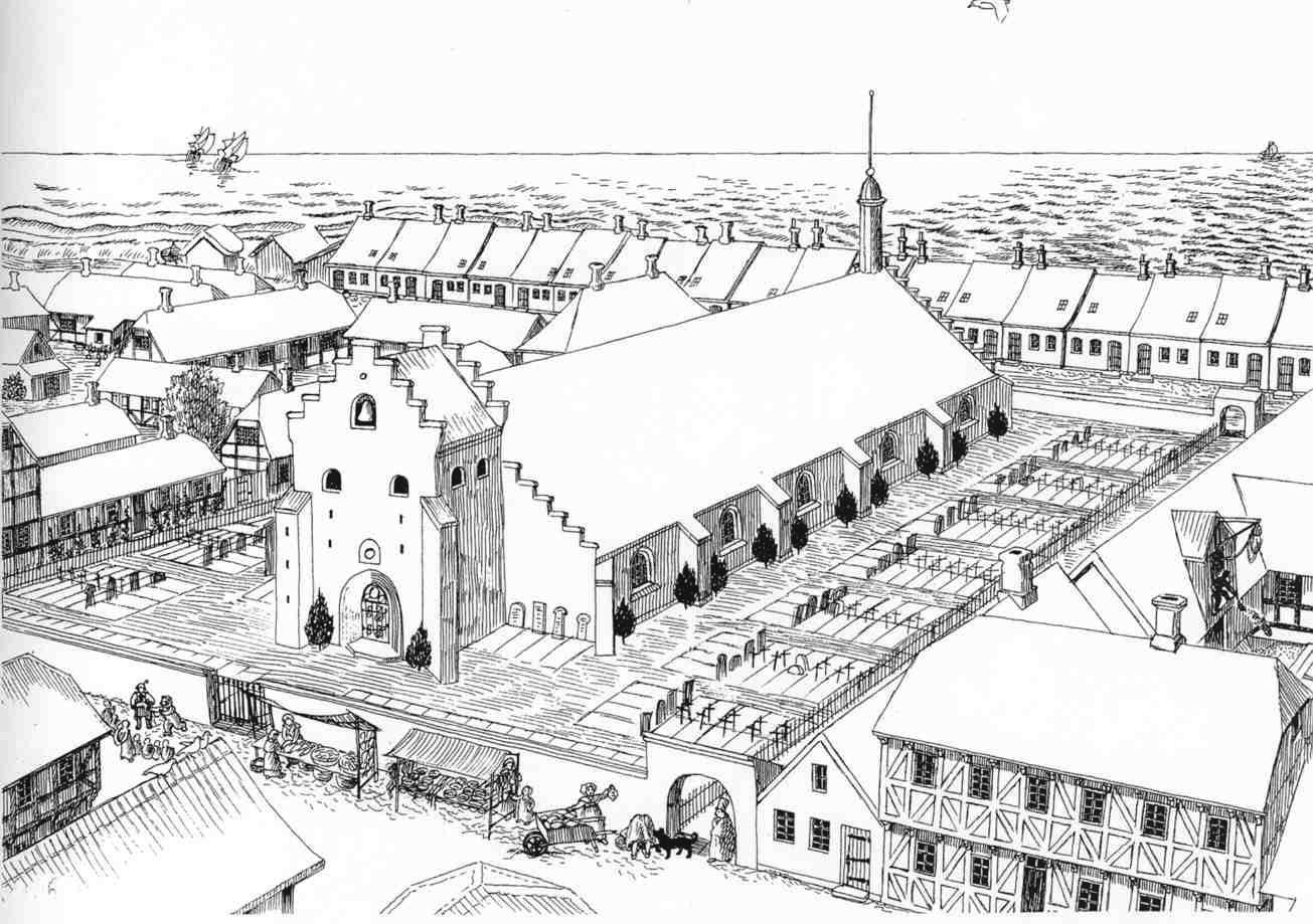 KIRKEN KOMMER TIL KERTEMINDE Omkring 925 gravsætter man en ukendt høvding ved bredden af Kerteminde fjord. Endnu er det vikingetid med asatroen. Med Odin og Thor og hele den nordiske gudeverden. Men den sang på sidste vers – hvad ingen af deltagerne i højtideligheden omkring Ladbyskibet vel kunne forestille sig. Men kristendommen bankede på døren sydfra. Faktisk var den katolske mission påbegyndt på dette tidspunkt. Og omkring 965 lader Harald Blåtand sig døbe, hvorved Danmark i realiteten bliver en del af pavedømmet i Rom. Om en brat overgang har der dog ikke været tale. I 1060 inddeler kong Svend Estridsøn landet i 8 bispedømmer – hvoraf det ene kom til at ligge i Odense. Omvandrende munke er vel også kommet til Kertemindeegnen. Rundt om i landskabet dukkede små landsbykirker op. Men ved fiskerlejet i Kerteminde skal vi helt frem til omkring 1300, før vi finder spor af den første kirke i byen. Kertemindes første kirkebygning