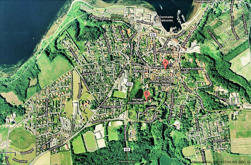 Dommerkontoret og dommerboligen i Mariager er overtaget af menighedsrådet i Mariager. Bygningen er under renovering og får forskellige nye ledninger ført ind. I den forbindelse har man påvist sydfløjen med tre parallelle fundamenter i brødrenes vestgård. Jeg kan fortælle videre om Munkegården - som ses ovenfor - at jeg fik fortalt af tjeneren i Bræd- dehytten i Hobro, at menighedsrådet havde købt den af Kulturarvstyrelsen og bitterligt fortrød, da restaureringen - som foregår nu - vil løbe op i astronomiske summer. Man føler sig simpelthen snydt. På billederne ser du et par medarbejdere fra Moesgård Museums arkæologiske afdeling i færd med at foretage en opmåling.