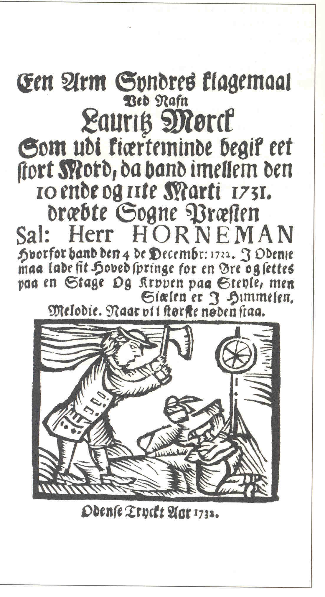 ”Vi vare Sødskend-børn begge, Vi elsked hverandre saa, At vi Os derfor maa ned legge For Bødelen vor Straf at faa. Mit Hoved for eet Svært gaar af, Oc nyder saa éen ærlig Graf.