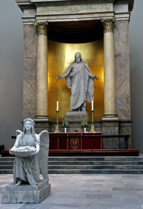 Billedhugger Bertel Thorvaldsen stod for den indvendige dekoration af Vor Frue Kirke. Han har kreeret statuen af Jesus, som står ved kirkens alter. Vor Frue Kirke er Københavns Domkirke. Første version blev opført i 1191. Under englændernes bombardement i 1807 brændte kirken ned. Arkitekt C.F. Hansen, tegnede den nye domkirke, der stod færdig i 1829 i nyklassicistisk stil. ----- Thorvaldsens skulptur, der forestiller Kristus, blev én af hans mest populære. Den var oprindelig bestilt af Slotsbygningskommissionen til at stå i Slotskirken ved Christiansborg Slot, men senere – mens Thorvaldsen var i København i 1819-20 – blev det besluttet, at den i stedet skulle stå i apsis, den østligste ende, af Vor Frue Kirke ved højalteret. Den blev opsat i 1833. Statuen blev senere af andre udført i mange afstøbninger og størrelser og kom til at stå i flere forskellige trosretningers gudshuse i USA og i Europa. I mindre størrelse stod den i talrige danske kirker – både på landet og i byerne. Statuen forestiller den genopstandne Kristus, der viser sig for menigheden med mærkerne i hænder og fødder fra korsfæstelsen. Thorvaldsen har fremstillet Kristus med naglehuller i hænder og fødder og med lansesåret i siden. Det er således den opstandne Kristus, som vi kender ham fra Johannes Evangeliet, kapitel 20, hvor han åbenbarer sig for Maria og apostlene. Model udført med bistand af P. Tenerani 1821-22. Gipsmodel fra 1828 stod i kirken til 1839. Da opstilledes marmoreksemplaret, der var i arbejde 1827-28, udført af P. Bienaime, dog med mange rettelser af Thorvaldsen selv. Det var H. E. Freund, der ledede opstillingen i 1839. Kristus står med armene bredt favnende ud mod os, men er samtidig tilbagelænet med vægten på højre fod. Han er klædt i et stort draperet, fodlangt klæde, der går op over begge skuldre, men lader venstre side at overkroppen være nøgen.