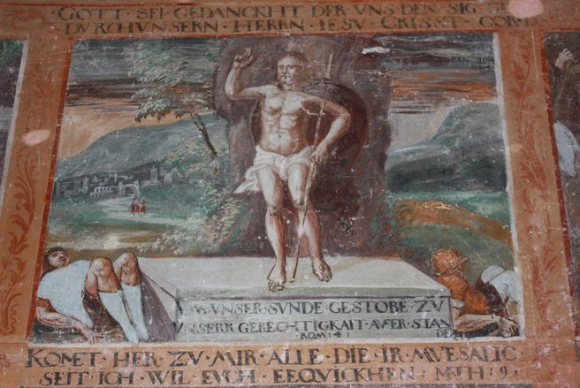 Note Indskrifterne understreger tre faser i Kristi liv: Guddommeligheden, hvor Gud legitimerer Kristus som sin søn: ’Denne er min søn…’ Kristi liv på jorden blandt de udstødte: ’Kommer til mig…’ Og endelig livet efter Kristi død og opstandelse, hvor vi skal bringe budskabet videre: ’Se jeg er med jer alle dage..’.
