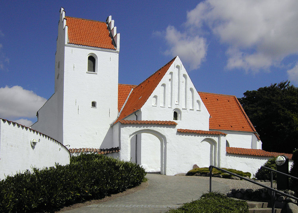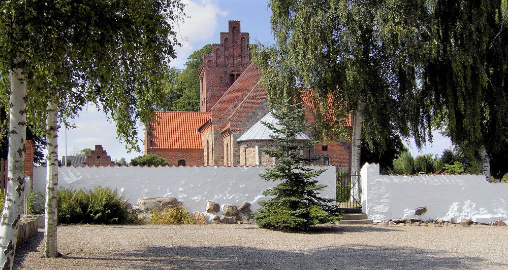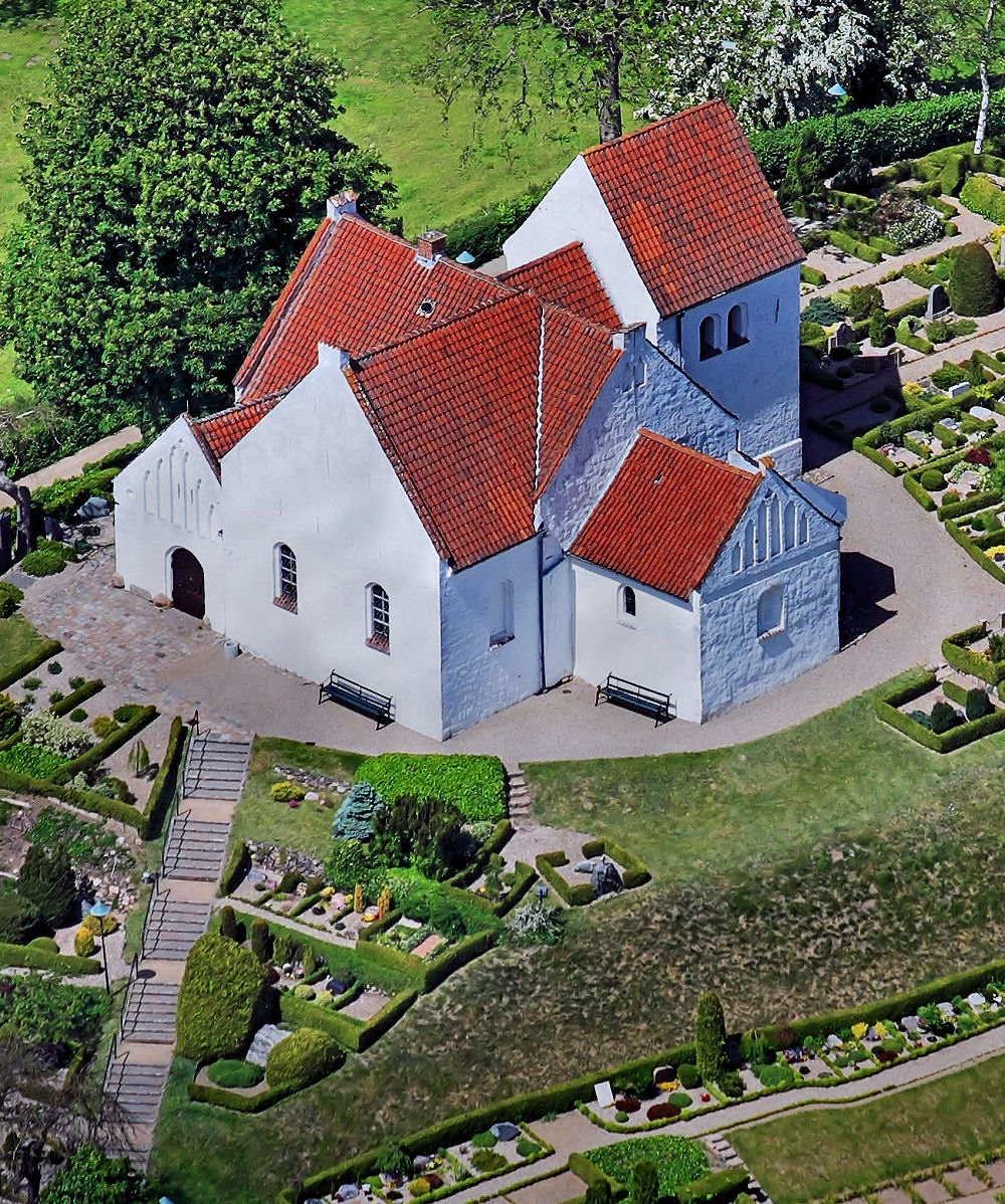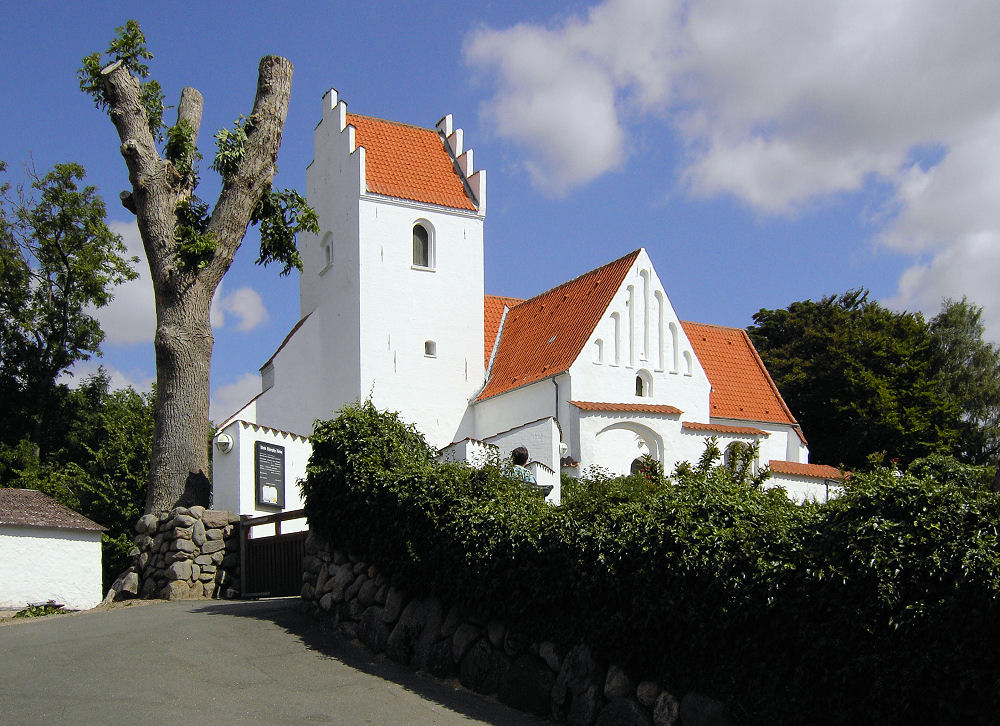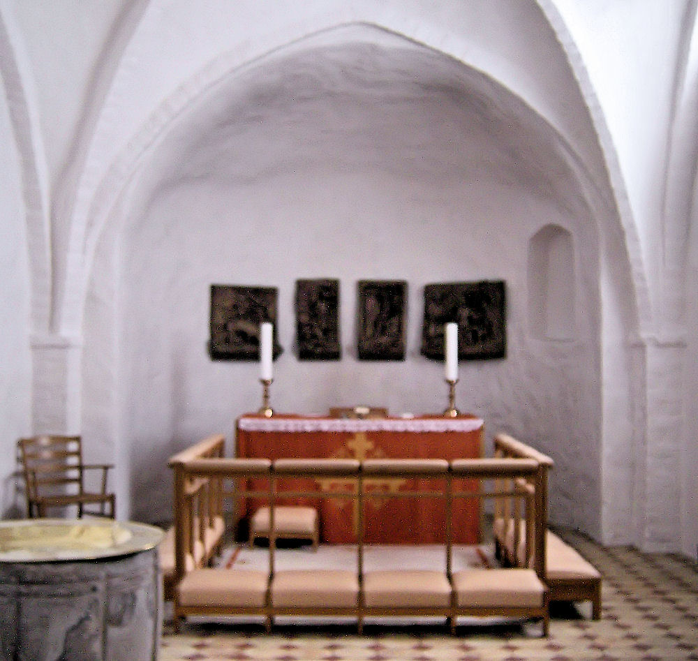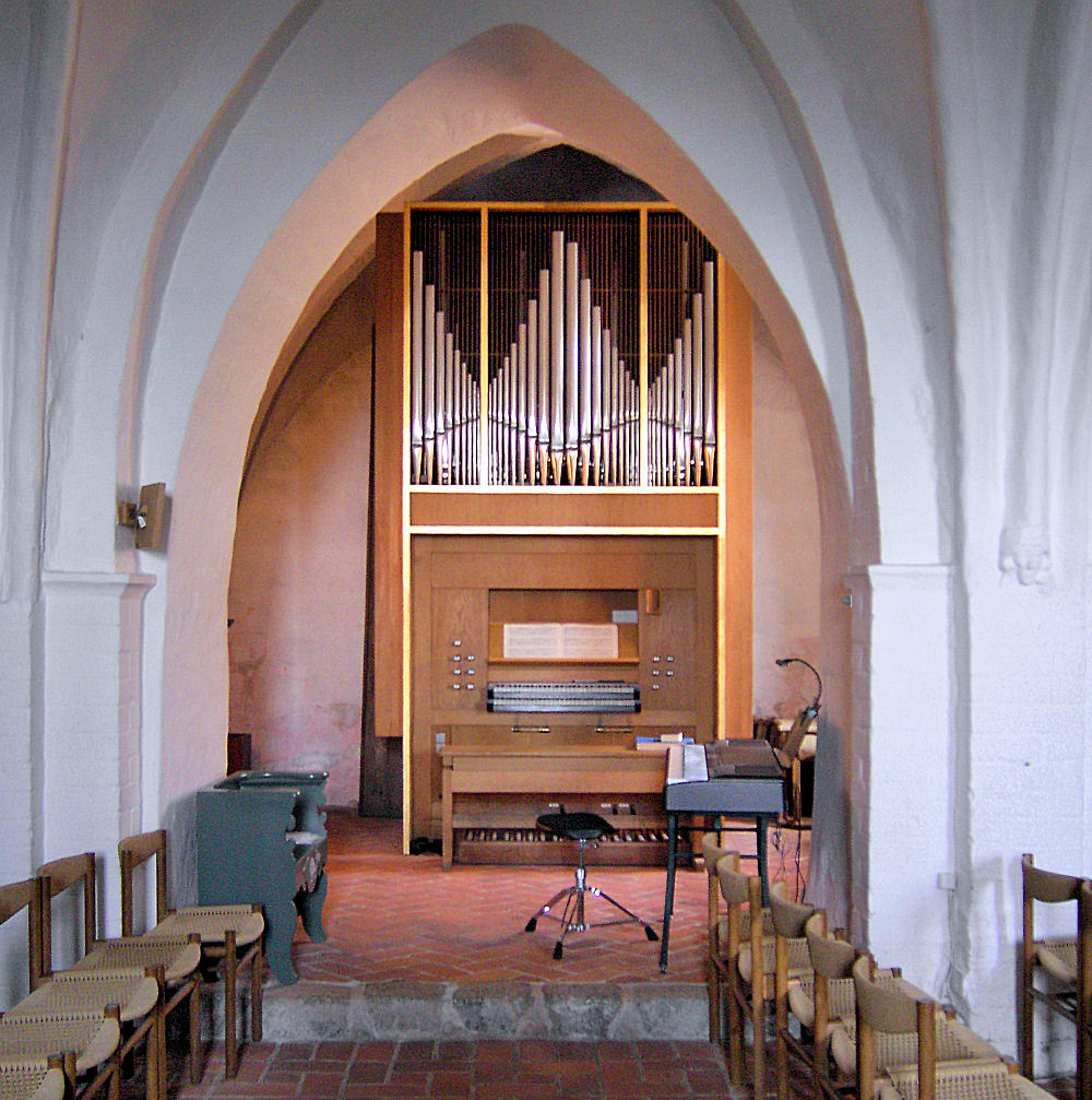 | Kirkens indre - "til Guds ære" Når man var vant til at dukke sig under bjælkerne og i den lave dør derhjemme, har det høje rum virket betagende, stemmende til andagt og ærefrygt. Hvilken højde! De fire vældige rundpiller drager blikket opad; også på dem afløses for oven kampestenen af munkesten. Højt oppe er der spændt otte grathvælv og i midten et ribbehvælv. Efter landsbyforhold må det have været overvældende. Og aller øverst er "ovensalen", kegletaget og spiret. Pillerne med de krumt huggede sten og frådstenskapitælerne for oven er et smukt syn i det bløde, dæmpede lys. De fortsætter opad gennem hele kirkens højde og bærer spiret. Selve kirkerummet, der svarer til en "treskibet" kirke, er kun 11-12 m i diameter, og de svære piller fylder meget. Man undrer sig over, at det fra de fleste siddepladser er umuligt at se præsten ved alteret og på prædikestolen. Men en katolsk middelalderkirke blev bygget "til Guds ære" og ikke til vor tids gudstjenesteform. Der var ingen siddepladser; man stod op. Messen var kort, der var ingen lang prædiken; man stillede sig, så man kunne se, hvad der skete ved højalteret eller døbefonten eller et af sidealtrene. Kirken var ikke blot til søndagsbrug - man kom og gik i Guds hus, til et øjebliks andagt og stilhed, eller når kirkeklokkerne kaldte til hverdag eller helligdag.