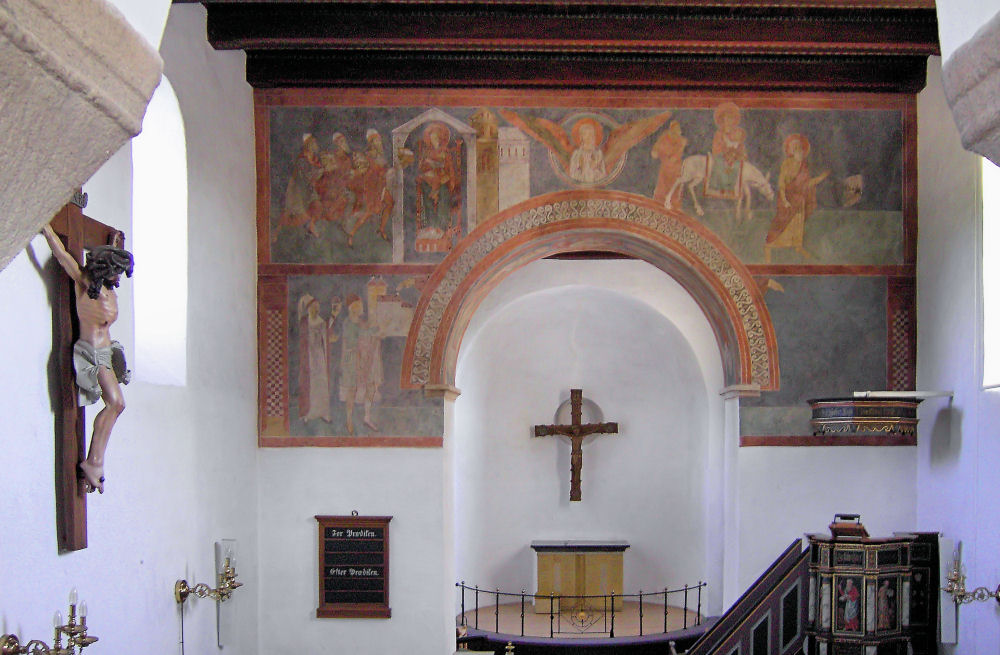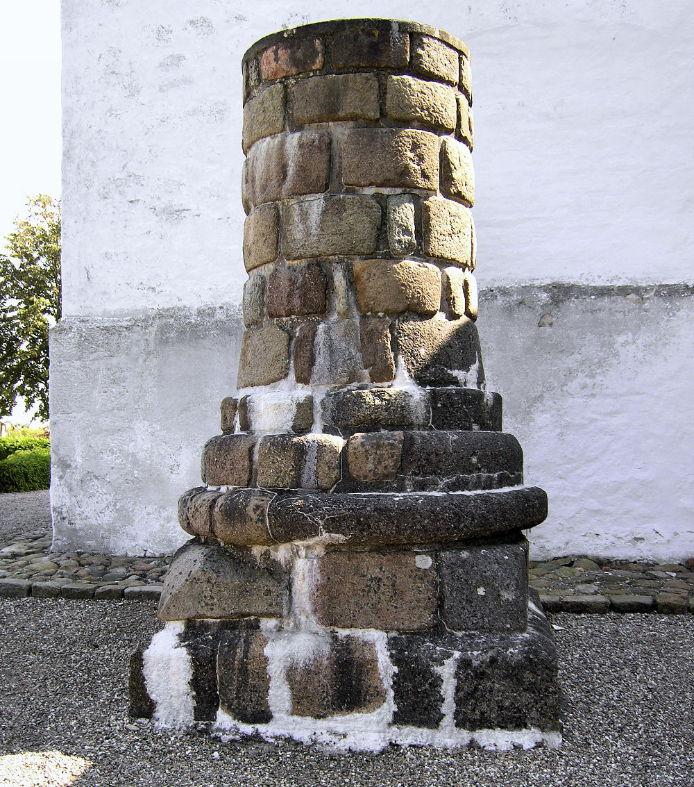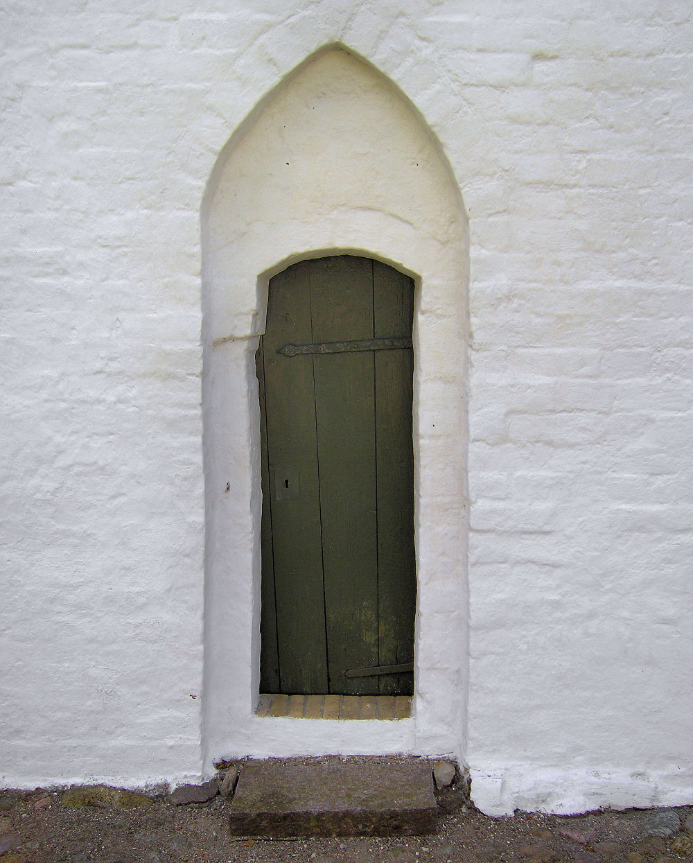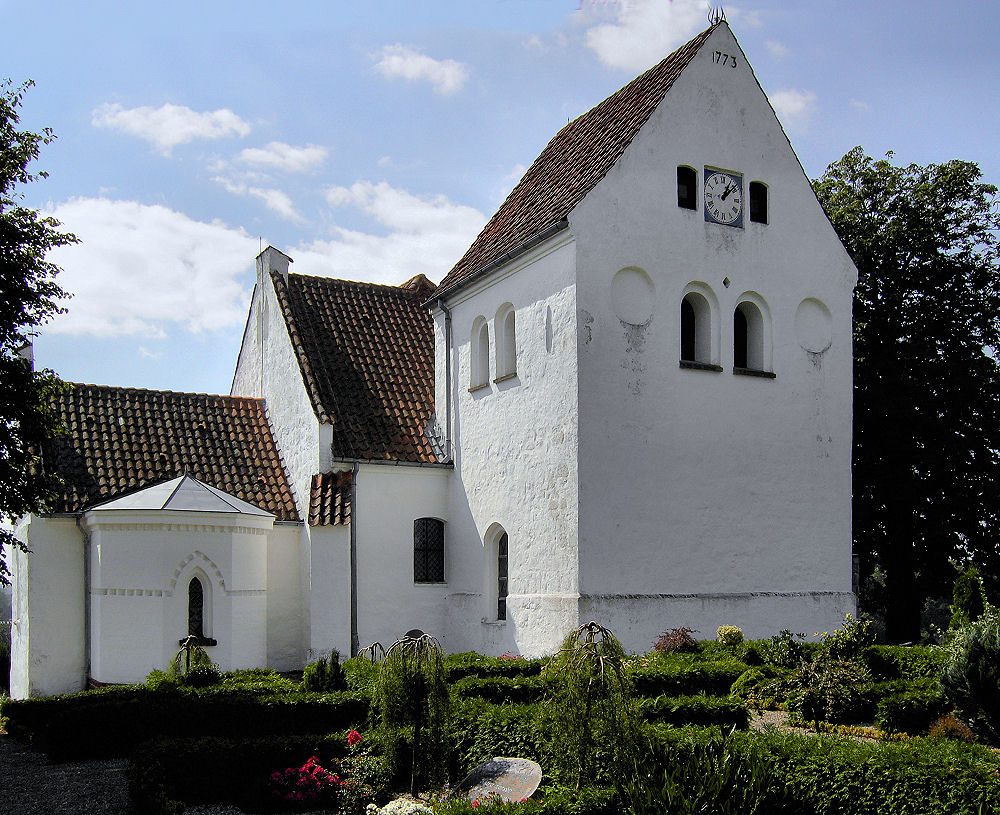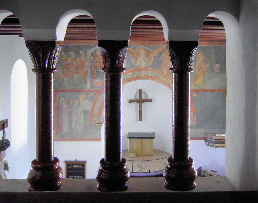 | Kirkens indre - "til Guds ære" Når man var vant til at dukke sig under bjælkerne og i den lave dør derhjemme, har det høje rum virket betagende, stemmende til andagt og ærefrygt. Hvilken højde! De fire vældige rundpiller drager blikket opad; også på dem afløses for oven kampestenen af munkesten. Højt oppe er der spændt otte grathvælv og i midten et ribbehvælv. Efter landsbyforhold må det have været overvældende. Og aller øverst er "ovensalen", kegletaget og spiret. Pillerne med de krumt huggede sten og frådstenskapitælerne for oven er et smukt syn i det bløde, dæmpede lys. De fortsætter opad gennem hele kirkens højde og bærer spiret. Selve kirkerummet, der svarer til en "treskibet" kirke, er kun 11-12 m i diameter, og de svære piller fylder meget. Man undrer sig over, at det fra de fleste siddepladser er umuligt at se præsten ved alteret og på prædikestolen. Men en katolsk middelalderkirke blev bygget "til Guds ære" og ikke til vor tids gudstjenesteform. Der var ingen siddepladser; man stod op. Messen var kort, der var ingen lang prædiken; man stillede sig, så man kunne se, hvad der skete ved højalteret eller døbefonten eller et af sidealtrene. Kirken var ikke blot til søndagsbrug - man kom og gik i Guds hus, til et øjebliks andagt og stilhed, eller når kirkeklokkerne kaldte til hverdag eller helligdag.