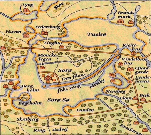 | Hvad skulle man egentlig bygge en borg for på dette sted. Ja, du tror det næppe, men det er sandt - landskabet har ændret sig. For blot 200 år siden lå Sorø på en ø. Deraf navnet SOR-Ø. Man kunne faktisk sejle hertil via Susåen.