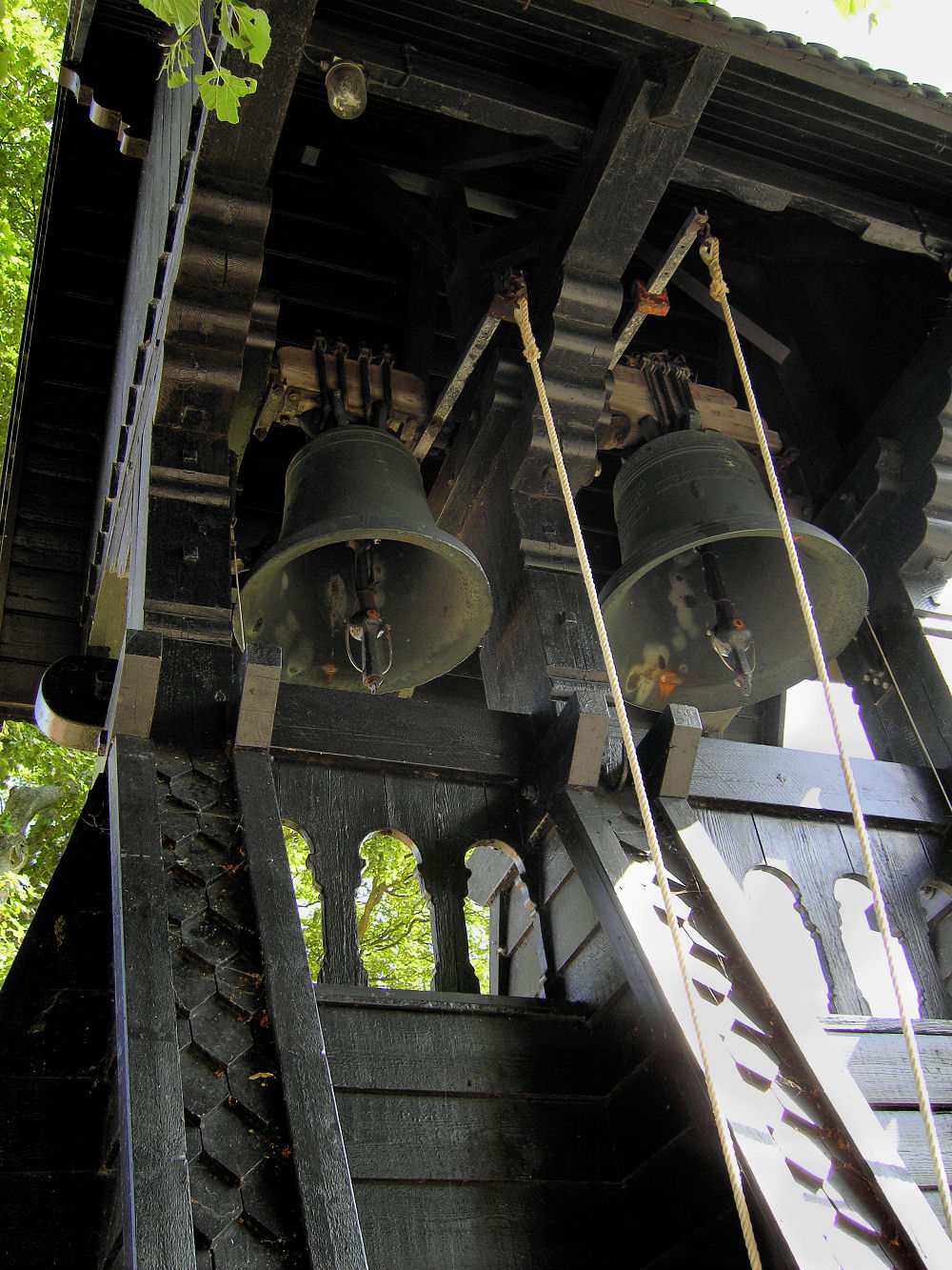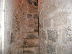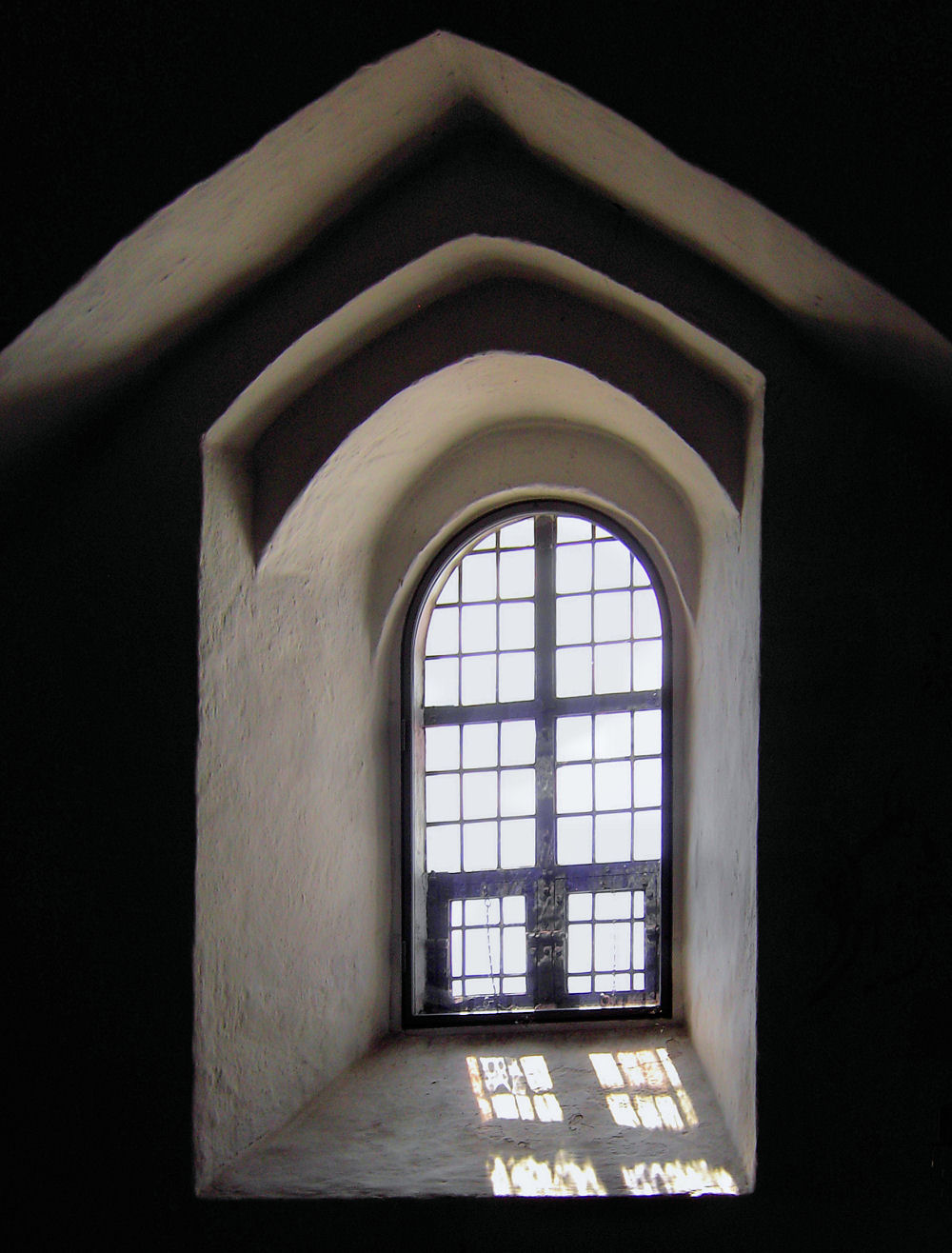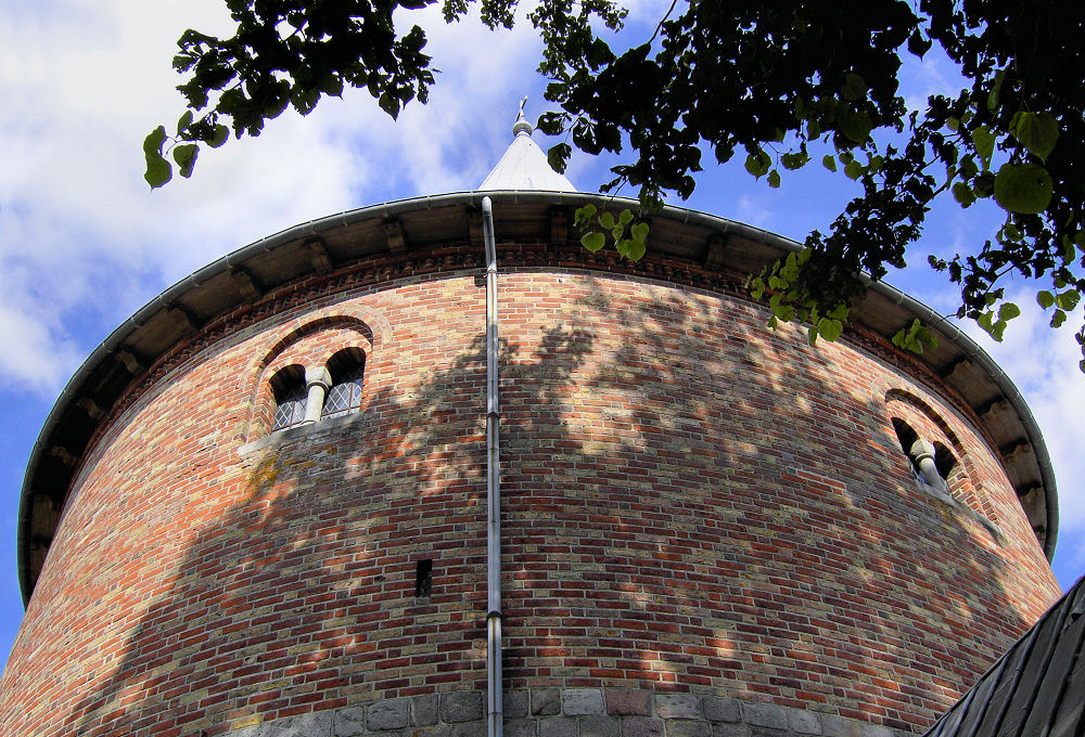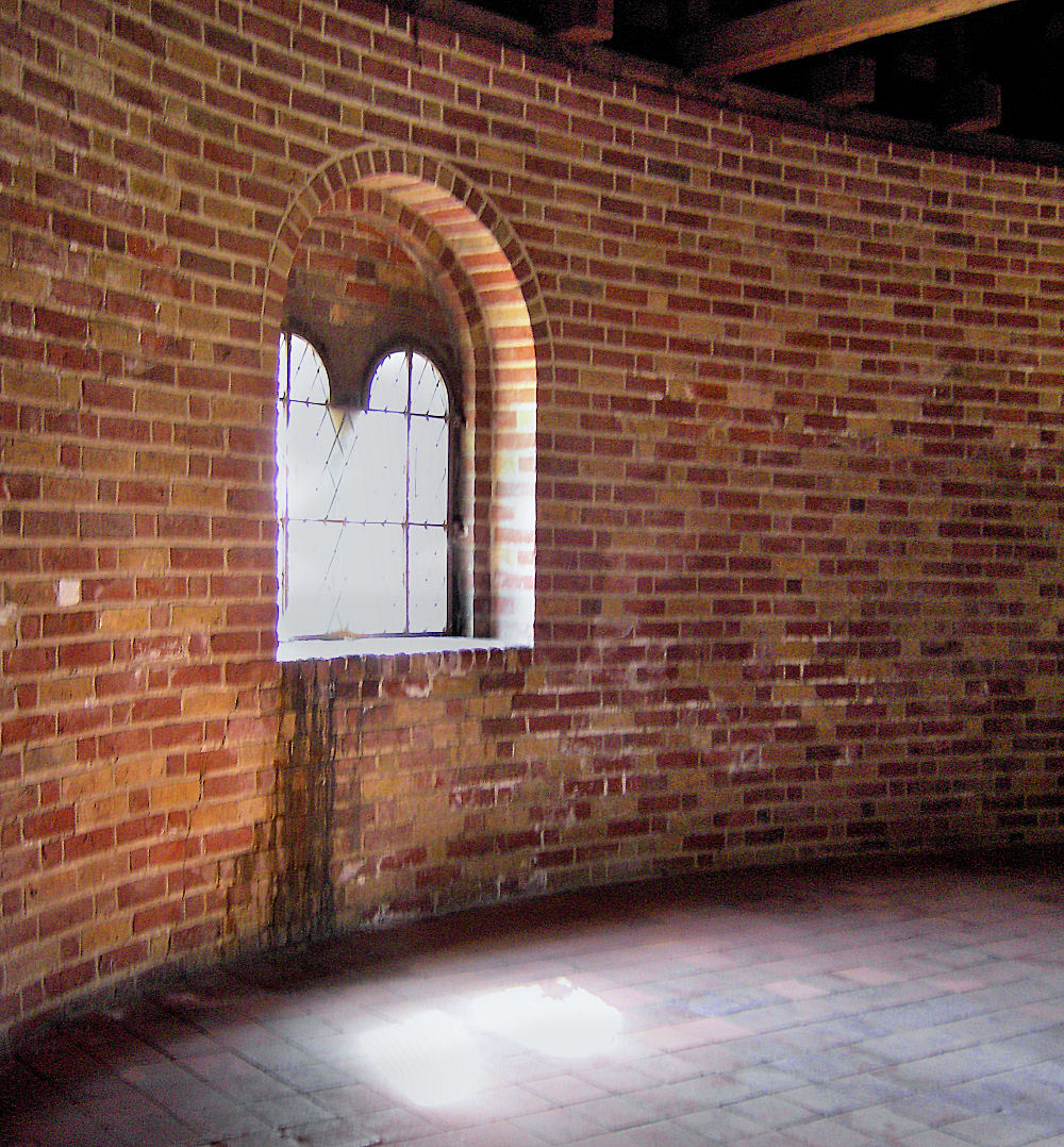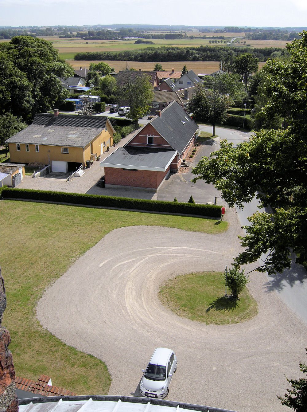 ![]() Den meget smalle snoede stentrappe. De fire murstenssøjler og trappenedgangen Ovensalen Vi måtte råbe om der var nogen deroppe, der var på vej ned - det var der. Man kan ikke passere hinanden. Vi mødte nogle mennesker der var der lige som os for at se kirken. De fotograferede med store dyre tunge digitalkameraer. Jeg ærgrede mig lidt over, at jeg ikke havde stativerne med og en batteridrevet videolampe, men det havde jeg glemt i skyndingen. Derfor er en del af mine billeder uskarpe og grynede. Nu køber jeg et professionelt kamera. Det er nu ikke kameraet i sig selv, der skaber billederne - det er efter min beskedne men faste overbevisning personen bag kameraet. Jeg kunne også slæbe professionelt fotoudstyr med, men jeg gider ikke slæbe rundt på det i store tasker. Mine billeder skal jo ikke bruges til reproduktioner i kunstbøger, men blot til at illustrere hvad vi har set på en tur og forsøge at give det videre med lidt kommentarer. Vi skal ikke hyppe nogle hellige kartofler og kan skrive som det falder os ind. Det mener vi det bliver mere menneskeligt og levende af. Jeg har lige regnet ud, at jeg har taget 10.000 billeder med mit lille billige digitalkamera fra ALDI, som jeg kan have liggende i lommen. Det har kostet 900 kr. Jeg skal lige sige, at en af de vanskeligste ting ved at fotografere inden i kirkerne er at alt får kraftige farveforskydninger - såkaldte farvestik. Heroppe i ovensalen - som et eksempel er der meget kraftigt rødt farvestik. Det er lyset udefra der kastes tilbage af røde teglsten og giver det hele et rødt skær. Jeg kan korrigere for det med hvidbalancen. Det vil sige jeg skal holde et hvidt lommetørklæde op foran kameraet og så indstille hvidbalancen. Det lyder jo simpelt, i praksis gider jeg det ikke. Alt er jo i virkeligheden farvet rødt af lyset herinde. Det er virkeligheden. Vi fik en snak med nogle af de besøgende. Nogle skulle videre til Fjenneslev lige som vi selv. Da vi forlod kirken faldt vi snak med en ung kvinde. Hun var ved at vaske døren ind til våbenhuset af. Hvorfor gør du det spørger vi. Jo, den skal males og så skal den være ren. Vi spørger om der er mange der besøger kirken. Ja, her i sommertiden kommer der virkelig mange om dagen, men hele året er der besøgende. Der kom flere busser ad gangen og de har egne førere med. Der er nogle der dyrker de her middelalderoverklassekirker som en helt kult. Vi går og funderer over om selveste biskop Absalon har holdt gudstjeneste her. Der har han 100% sikkert, det var jo familiens ejendom. Dukker man fra den mørke trappe op i lyset, står man i et stort, rundt rum, 3,6 m højt, med 6 smukke, romanske dobbeltvinduer og med tømmerkonstruktionen i kegletaget over ens hoved. De fire svære bæresøjler er heroppe firkantede. Allerøverst er det ottekantede tårn; en trætrappe fører derop. Heroppe er en enestående udsigt. I ovensalen er ophængt professor Storcks alterprydelse fra 1892. Det øverste af kirken fik sit udseende i 1890-92. Hvad har rummet været brugt til? Mellem de fire søjler har der uden tvivl været en forhøjning med et alter. Indhuggene i søjlernes mursten tyder derpå. Et krucifiks eller lignende har været alterprydelse, og bag alteret har man set mod det kløverbladsformede vindue mod øst. Kirkens senere skæbne