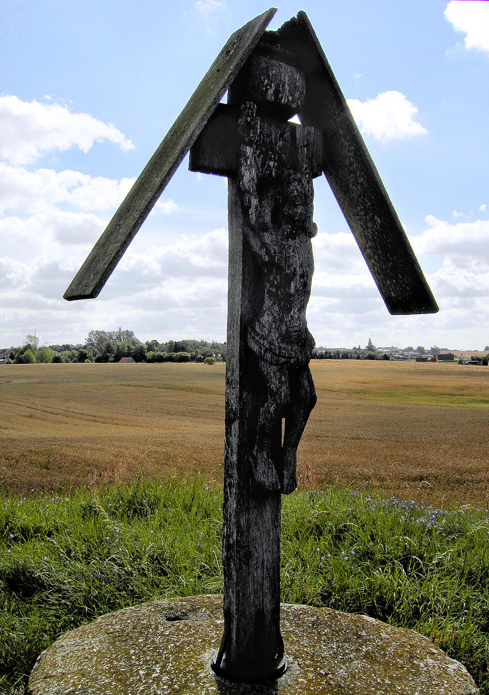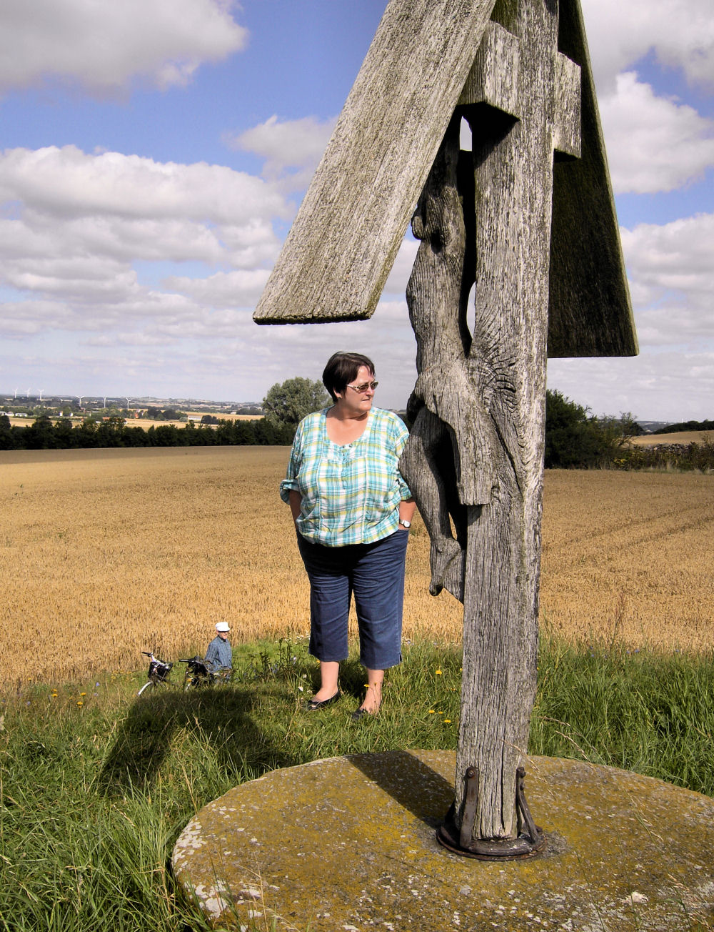 | Vi har besluttet os for, at når det bliver godt vejr igen vil vi køre en tur rundt og se på steder vi er kørt forbi, men aldrig har set rigtigt. Det skal bare lige blive godt vejr igen. Det ser det ud til at blive mandag den 13. august 2012, men vi venter til tirsdag den 14. august, der tyder vejret på at blive bedst. Det bliver det. Vi pakker bilen - en lille billig i10 fra Huyndai - med lidt drikkevarer, lidt frugt og lidt slik og jeg køber lidt tobak i Brugsen. Nu skal GPS´en stå sin prøve. Vi har mandag aften gennemgået vor rute - men tilsyneladende ikke grundigt nok. Vi bliver dirigeret på nogle omveje og Tystrup-Bavelse søerne og Susåen kommer vi aldrig til. Vi må droppe Gyrstinge og Haraldsted og der er flere kirker som vi bare kører forbi, fordi vi ikke kan nå det - og heller ikke orke så meget på en gang. En ting er dog hjemme det gode vejr. Det er rigtigt varmt og et super-flot vejr. Vi lægger ud med Hellig Anders. Det er Slagelses skytshelgen og omkring 5 kilometer vest for Slagelse by ved landevejen Korsør-Slagelse skulle der være et kors. Vi er kørt her forbi tusinde gange i årenes løb, men har aldrig set noget kors. Vi tror det står ud til vejen. Det gør det også, men landevejen er blevet forlagt, så man skal ind til det. GPSen finder det for os. Det er vejkrucifiks, der står på en af de mange bronzealderhøje vi har området. Disse høje har vi haft 150.000 af i landet - i dag er der omkring 50.000 tilbage. Der er sikkert nogle der tror, at det er Hellig Anders der hænger på korset, som er et typisk vejkrucifiks som vi kender dem fra det sydlige udland. Det er det ikke - det er frelseren - her i en noget frønnet og forsumpet udgave. Der er en fantastisk udsigt heroppefra. Det er godt sted at aflægge besøg. Det hele er i en trist forfatning. Informationstavlen mangler informationssiden. En stor brun bagerpose med tomme blikdåser og andet affald er henkastet på stedet. Kommunen kunne ikke drømme om at opsætte bænk og bord og affaldsstativ - pengene skal bruges til vækst for erhvervslivet. Denne vækstfilosofi med stadig vækst i forbrugerismen og køb og smid væk mentalitet er ikke lige os. Vi mener ting skal være bæredygtige og vi hader produkter med indbygget forældelse. Vor klode har ikke så mange ressourcer, at vi bare kan lave alt om til affald, som vi ikke ved hvor vi skal gøre af. Pludselig kommer en mand cyklende. Davs med dig - råber vi - kom herop og se på den Hellige Anders. Han stiller cyklen og kommer op til os. Hvad er det her for noget? - siger han. Der står ikke noget på informationstavlen. Så får han historien om Anders der var draget på korstog til Jerusalem, da han skulle hjem var der en der tog ham op så sin hest, men Anders var meget træt og faldt i søvn. Han vågnede op næste dag her på højen og skyndte sig hjem til Skt. Peders kirke i Slagelse (byens ældste bygning), hvor han var præst - så han lige kunne forrette vesperen. Heraf kan man lære, at hvis man virkelig tror, så kan alt lade sig gøre. Han må jo være blevet fløjet hjem med Angel Airlines fra det Hellige land. Det fortælles også om ham - og det skulle være rigtigt sandt, at engang fik han en aftale i stand med kongen, der var på besøg i Slagelse. Han fik lov til at få så meget byjord til Slagelse by som han kunne nå at omride på et ni dage gammelt føl, mens kongen tog sig et bad. Dengang i middelalderen kunne man godt tage lange bade, og det var da også ved at blive farligt for kongen med den aftale. Nu må du se at komme op af badet og få tørt dig i en fart - sagde kongens mænd - ellers fortryder du bittert aftalen. Det er derfor Slagelse er så stor en by i forhold til sit beskedne indbyggertal. Det var godt, at jeg mødte Jer - ellers havde jeg da aldrig fundet ud af, hvad det her er for noget. Jeg kommer fra Odense og er taget med toget over med min cykel. Jeg kører ad cykelrute 6 og har lige været gennem Svenstrup. Jamen der kommer vi fra. Det går ellers godt op ad bakke hertil. Jeg har bestilt bed and breakfast til overnatning ude ved Harrested. Vi fortæller ham om vore planer og drøfter lidt Danmarkshistorie og munkeliv. Nu vil jeg sætte mig ned ved foden af højen og hvile mig og nyde udsigten i det gode vejr. Kan I ha en rigtig god tur. Tak i lige måde - siger vi. Pas nu på ikke at falde i søvn her, så kommer Englene bare og tror de har en transportopgave.