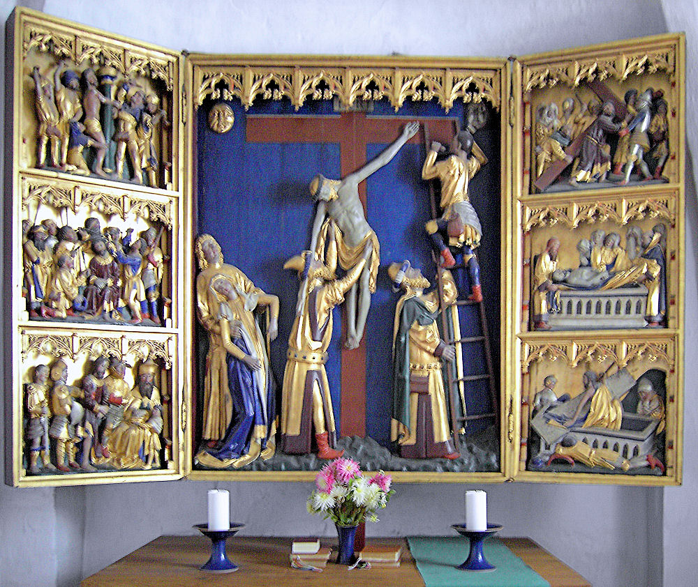 Altertavlen er sengotisk fra ca. 1475. Heller ikke her kender vi kunstnerens navn; vi véd ikke engang, om det er et dansk eller udenlandsk — måske flamsk — arbejde. I tiden før reformationen 1536 - den katolske tid - lukkede man i fastetiden de to fløje i - for så atter at åbne dem på den festlige påskedag. Altertavlen er en billedbog om Jesu lidelseshistorie fra natten før langfredag til påskemorgen. I højre sidefløjs midterfelt ses gravlæggelsen, ikke i en klippe- grav, men i en kongesarkofag, som man kendte dem i 1400—tallet. Nederst til højre endelig Jesu opstandelse påskemorgen. | |