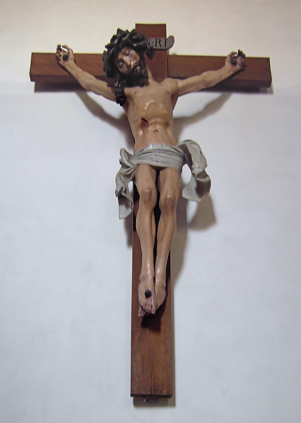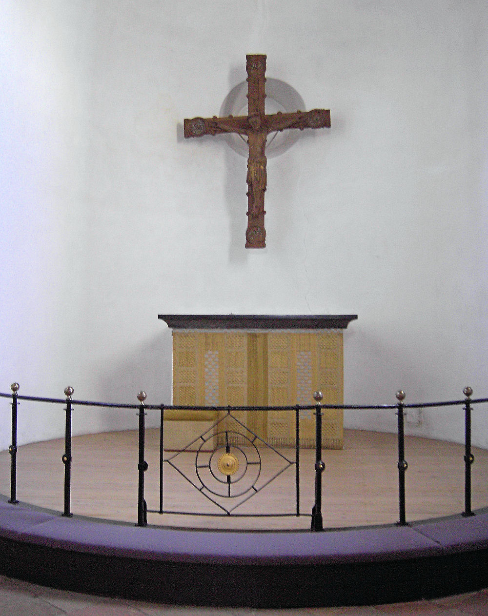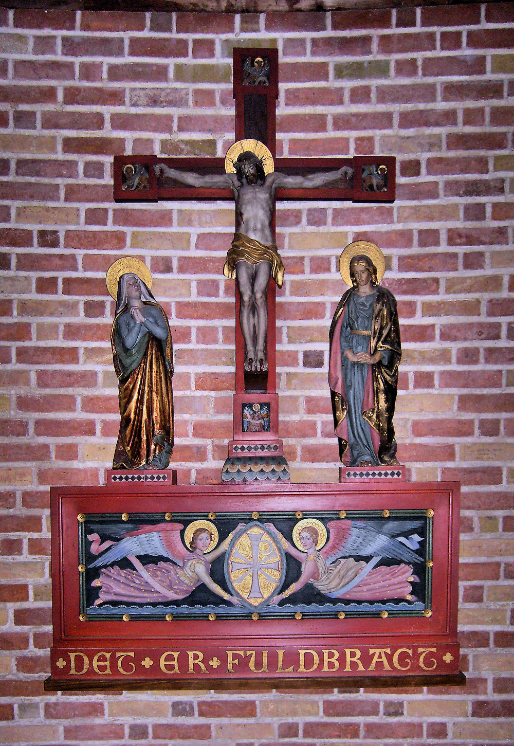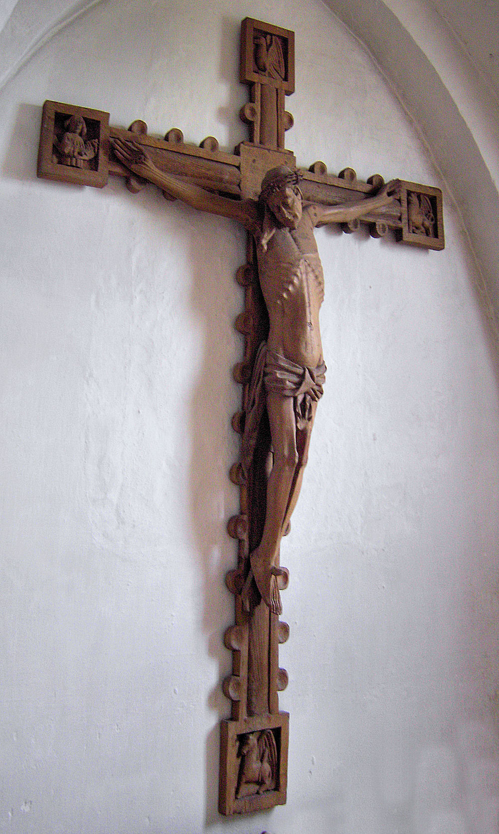 | Det ældste inventar er sideskibets store egetræs—krucifiks fra ca. 1450, oprindelig et korbuekrucifiks. Skildringen af den lidende Kristus er typisk for sengotisk tid. Langs korstræets kanter sidder stiliserede blade eller knopper, idet den ukendte kunstner opfatter korset som livets træ, kendt fra paradisets have. Korsets ender danner symbolerne for de fire evangelister: Englen (Mattæus), løven (Markus), oksen (Lukas) og ørnen (Johannes). Vi kender netop denne udformning af et krucifiks fra utallige andre danske kirker. | |