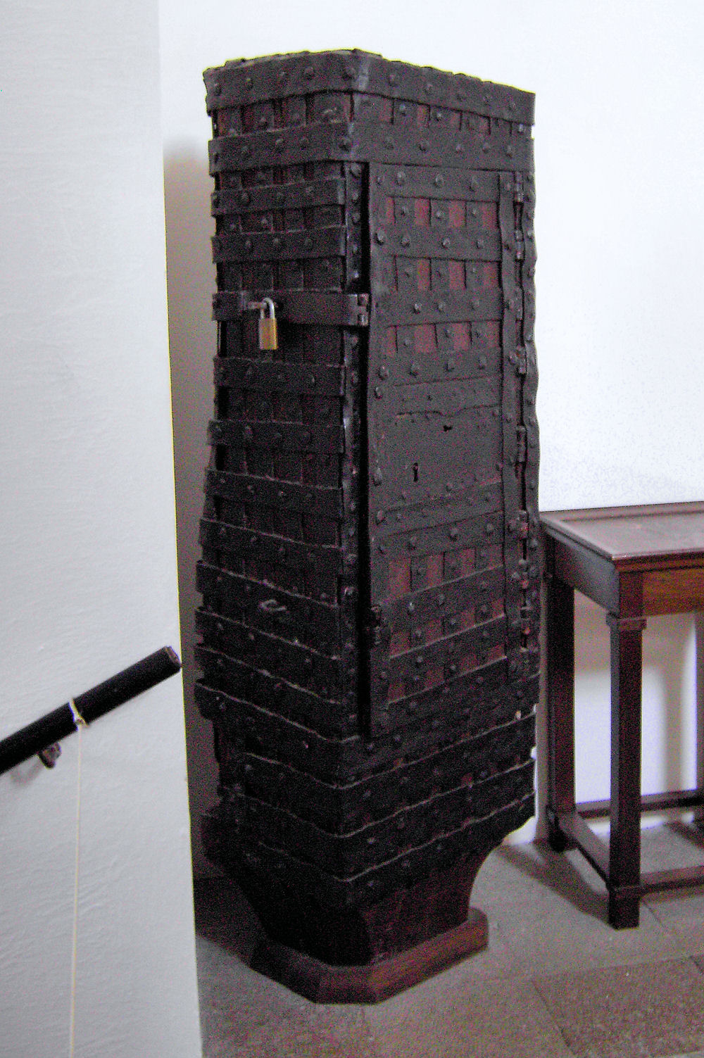| Monstranskabet til venstre i koret er sengotisk. Det er af egetræ og beslået med svære jernbånd. I den katolske tid før reformationen i 1536 mente man, at der skete et forvandlingsunder når præsten hævede (eleverede - lige som i en elevator) brødet og vinen i kalken (bægeret) så man nu havde Jesu legeme og blod. Blev det hele ikke anvendt til nadveren blev resterne at det forvandlede opbevaret i dette skab. Man kunne ikke have, at nogen stjal det og solgte det på det sorte marked. Det ville være nemt at afsætte som mirakelmedicin. Eller værre endnu, at rotter og mus åd og drak deraf. Det ville være ren helligbrøde. Efter reformationen er opfattelsen den, at der ikke sker nogen forvandling. Nadveren er et rent mindemåltid og ikke en lille fest for kannibaler. | |