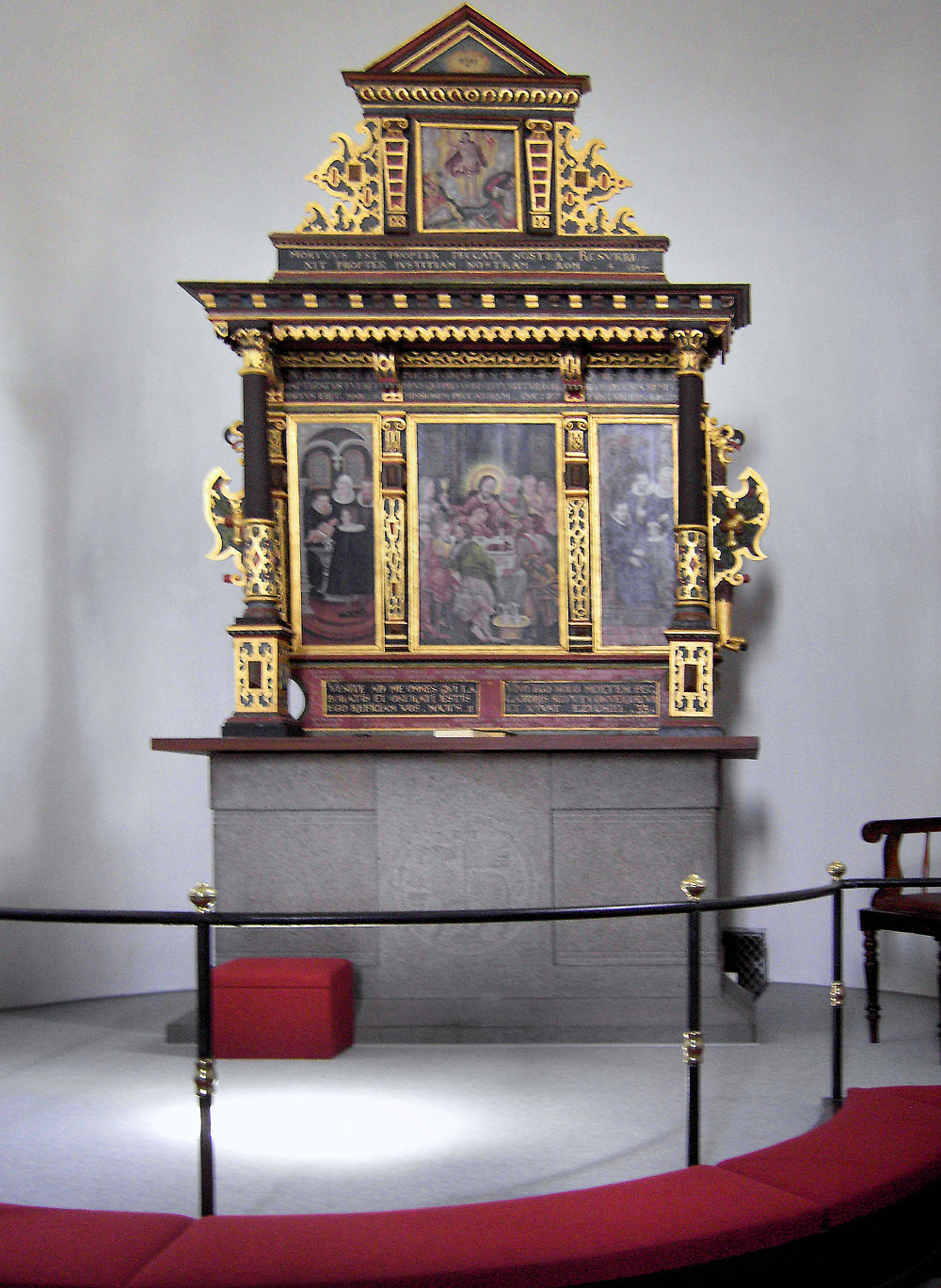 | Alteret Under den bemærkelsesværdige, slanke korbue (ca. 5,6 m høj) går man ad trinene op til alteret. Altertavlen stammer fra 1615 og den er et fremragende eksempel på denne type altertavler, som nu er meget sjældne herhjemme. Ved en noget hårdhændet restaurering af professor H. B. Storck i 1892 af hele kirken, blev altertavlen forvist til en plads ved siden af orglet nederst i kirken. Her hængte den i mere end hundrede år, indtil Nationalmuseet fandt ud af, at den var et nationalt klenodie, som nu trængte hårdt til istandsættelse. ved en grundig restaurering på konservator Ole Dufours værksted i Roskilde fremdrog man en spændende tekst, der fortalte, at Magister Johannes Stephanius, Den kongelige Schola Soranas sjette forstander, sørgede for, at denne altertavle til Herrens bord udfærdigedes på kirkens bekostning i menneskets frelses år 1615 ved degn Jørgen Larsen og Mikkel Hansen, kirkens beskyttere. Ved Johannes, Peter og Jakob beder han under bønfaldelse. Amen. Magister Stephanius havde været elev hos Tycho Brahe. Han studerede i Wittenberg, blev universitetsprofessor, kom derefter til Sorø og efter Sorøtiden blev han kongens historiograf. Han endte sine dage i Roskilde. Der blev endvidere fremdraget flere bibeltekster, og måske allervigtigst: Altertavlens billeder blev renset og trukket op. Topheltet viser den genopstandne Kristus med sejrsfanen (Dannebrog). I midterfeltet ser man de tre sakramenter: Dåben, Nadveren og Skriftemålet. Den nyrestaurerede altertavle blev genopsat på sin gamle plads på alteret den 21. september 2003, og den altertavle som professor Storck havde tegnet, fik en anden plads i kirken. | |