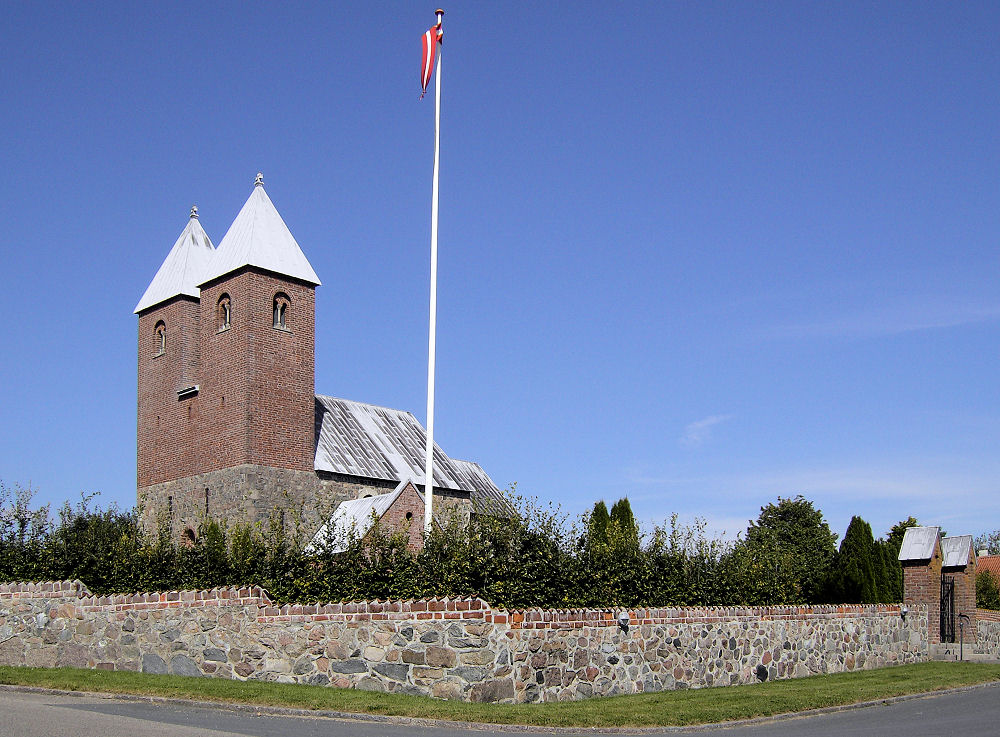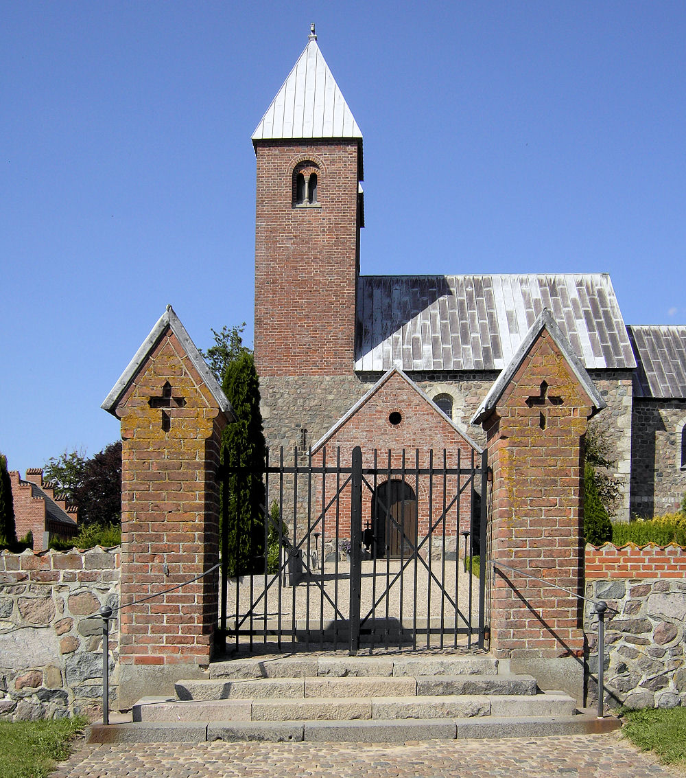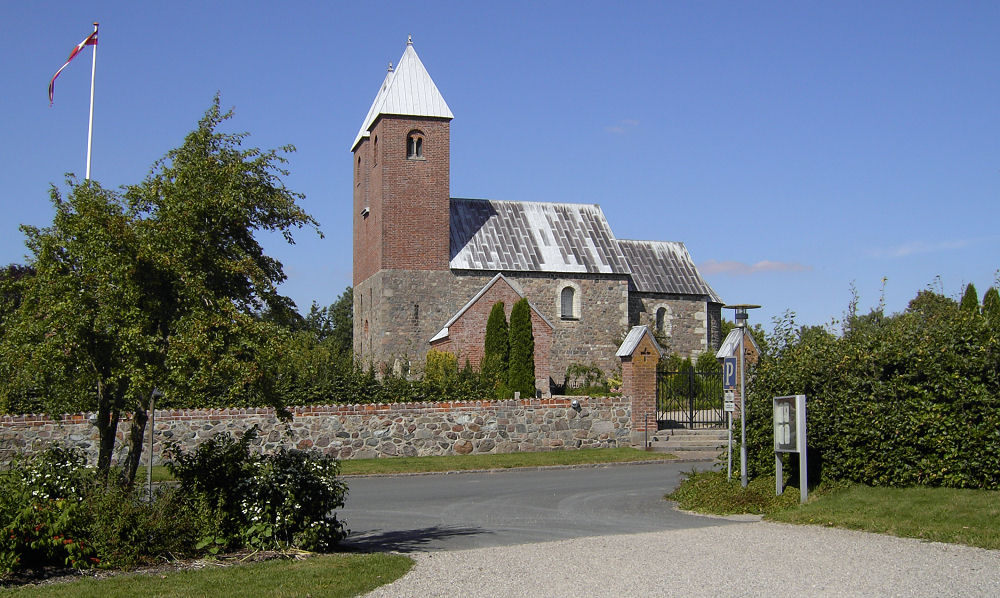 | I løbet af 1300—tallet begyndte man at bygge den nuværende kirke på det sted, hvor selve borgen havde ligget. Man genanvendte kampestenskvadrene fra borgen og fra rundkirken, men man brugte også det nye materiale: munkestenen. Oprindelig bestod kirken kun af det forholdsvis korte og brede skib og det lille kor mod øst. Rester af kalkmalerier i koret — heriblandt et par velbevarede indvielseskors — viser, at koret har haft et fladt loft. Derimod er skibet fra første færd bygget med hvælvinger for øje. Disse hvælvinger opmuredes i 1400— tallet. Mands-indgangen har været mod syd, omtrent hvor den nuværende dør er. Kvindeindgangen mod nord er tilmuret; men over denne ses udvendig en granit-tympanon, der tidligere formodentlig har siddet over døren til rundkirken. Ingen af kirkens oprindelige vinduer er bevaret. Dog ses korets tilmurede østvindue udvendigt i muren. Omkring 1550 tilføjedes mod nord tårnet og mod syd sideskibet — også kaldet ”Haugerup kirke” efter en landsby i sognet.