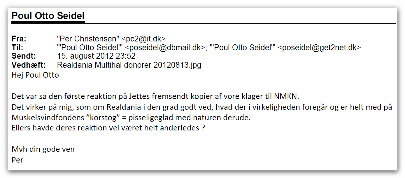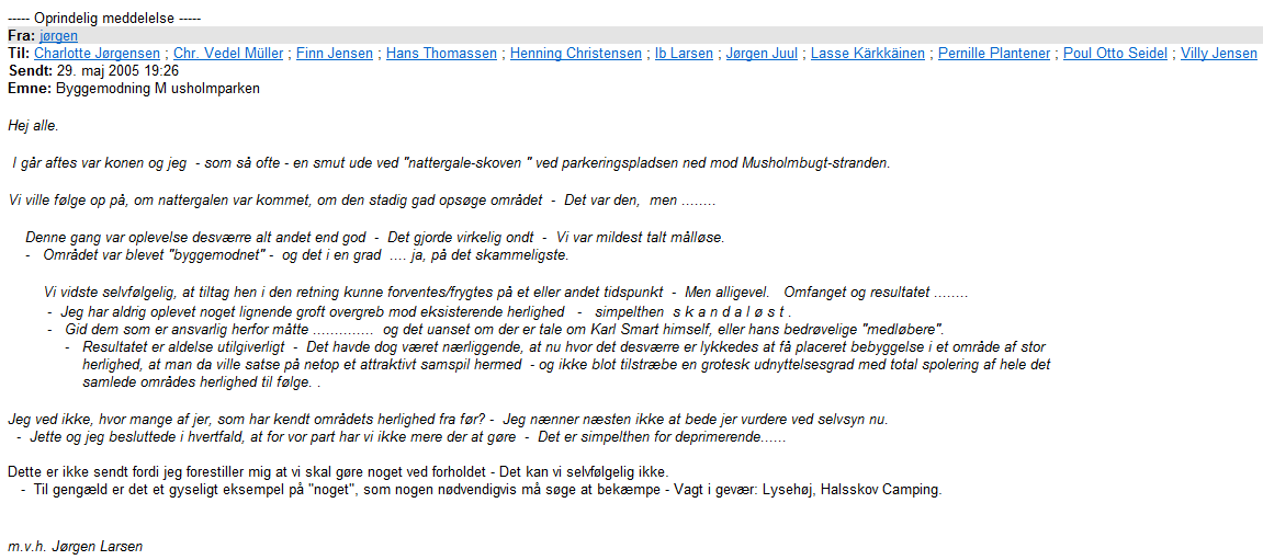 http://www.tv2east.dk/artikler/millionbyggeri-ved-feriecenter-paa-kant-med-loven Den 7. marts 2014 fik vor Natur- og miljøgruppe tilsendt en kopi af en dispensation fra skovbyggelinjen. Afsenderen kunne af indholdet se, at denne afgørelse givet måtte have vor interesse og fandt det for groft, at kommunen ikke havde offentliggjort den. Så fik vi travlt, med at få indsamlet oplysninger og med at få stablet en klage på benene. På vor ordinære generalforsamling den 22. marts 2014 fik vi godkendt, at vi forfulgte sagen og internt i bestyrelsen blev det aftalt, at denne sag blev kørt af 3 fra Natur- og miljø gruppen, hvoraf de 2 havde fast ejendom i det berørte område. Det blev også aftalt, hvem der stod for pressedækningen - således, at vor forenings nyvalgte formand ikke skulle løbe spidsrod i en sådan sag, der kræver at man kender den komplicerede lovgivning på fingerene. I sagen her har den gamle formand været skriverkarl - eller rettere tekstforfatter, mens Per har stået for kontakterne til myndighederne i form af mails og telefonsamtaler samt pressedækningen. VI har holdt møder om sagen og har daglig været i telefonisk kontakt og det har ofte været i de sene nattetimer. Per og jeg arbejder fantastisk godt sammen og jeg glæder mig over Pers fantastiske drive og Per er til gengæld glad for min juridiske ekspertise og min årelange erfaring. Vi ved, at man fra kommunens side vil gøre alt for at bremse os. Man forsøger at bilde Naturklagenævnet ind, at vi ikke er klageberettigede og at skoven ikke er beliggende i vort virkeområde. Det holder ikke en meter og det er jo trist, at vi har medlemmer der er naboer til skoven.