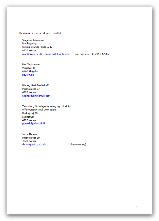 | VI ER TRE KLAGERE DER HAR DRØFTET DENNE AFGØRELSE - VI ER PÅ INGEN MÅDE TILFREDSE MED DEN. SJÆLDENT HAR VI SET EN AFGØRELSE DER I DEN GRAD FORSØGER AT ARGUMENTERE SIG UD AF PROBLEMSTILLINGERNE. FOR OS ER SAGEN ENDNU IKKE SLUT. DER STÅR TO HOVEDSPØRGSMÅL TILBAGE: VI KAN IKKE ACCEPTERE DENNE ARGUMENTATION: Lokalplanområdet grænser i det nordvestlige hjørne op til et Natura 2000-område: Habitatområde nr. 100, Centrale Storebælt og Vresen Fuglebeskyttelsesområde nr. 98, Sprogø og Halsskov Rev. Ifølge bekendtgørelse nr. 408 af 1. maj 2007 om udpegning og administration af internationale naturbeskyttelsesområder samt beskyttelse af visse arter skal der foretages en vurdering af, om projektet i sig selv, eller i forbindelse med andre planer og projekter, kan påvirke et Natura 2000-område væsentligt. Det skal samtidig vurderes, om gennemførelsen af lokalplanen kan beskadige eller ødelægge yngle- eller rasteområder i det naturlige udbredelsesområde for de dyre- og plantearter, som fremgår af habitatdirektivets bilag IV. Slagelse Kommune har vurderet, at lokalplanen ikke i sig selv eller i forbindelse med andre planer og projekter kan påvirke naturtyper eller arter i udpegningsgrundlaget for Natura 2000-området (splitterne, ederfugl og marsvin) væsentligt, og at ingen bilag IV-arter i området vil blive negativt påvirket af projektet. Kommunen har dog ikke detaljeret kendskab til enkelt arters forekomst i området. VI NOTERER OS HER, AT NÆVNET IKKE VURDERER NOGET SOM HELST SELVSTÆNDIGT, MEN LADER SLAGELSE KOMMUNES VURDERING - DER IKKE HAR NOGET DETALJERET KENDSKAB TIL TINGENE VÆRE DEN AFGØRENDE VURDERING. DEN AFGØRELSE VIL BLIVE INDBRAGT FOR EU-RETTEN. Klagerne har navnlig gjort gældende, at det i sin tid i forbindelse med tilvejebringelsen af Lokalplan nr. 88 var en betingelse fra den daværende miljøministers side for Miljøministeriets stillingtagen, at feriecentret udelukkende var for handicappede. Klagerne har imidlertid fået oplyst, at en bestemmelse, der forbeholder feriecentret for en bestemt brugerkreds, ikke kan indeholdes i en lokalplan. Med udvidelsen af centret er det således hensigten at give mulighed for, at også andre feriegæster kan leje sig ind. Klagerne mener, at dersom de oprindelige forudsætninger for feriecentrets opførelse er bristet, er der ingen grund til at opretholde centret. Det bemærkes, at Lokalplan nr. 1100 i § 3 indeholder bestemmelse om, at området fastholdes til feriecenter og ferieboliger for handicappede. Slagelse Byråd fastholder således forudsætningen om en særlig brugerkreds, selv om man er vidende om, at en sådan bestemmelse ikke er lovlig og uden reelt indhold. Klagerne finder det beskæmmende, at kommunen i ond tro opretholder en retsvildfarelse for at imødegå reglerne for etablering af feriehoteller i kystnærhedszonen og dermed fremme en udbygning af et feriehotel – ikke kun for handicappede, men for alle der har lyst til at leje sig ind. Klagerne havde hilst det oprindelige feriecenter velkomment og havde heller ikke til sinds at klage over udbygningsplanerne, før det stod klart, at det ikke handlede om handicappede og deres ve og vel. DETTE HELT AFGØRENDE SPØRGSMÅL I SAGEN VIL BLIVE INDBRAGT FOR OMBUDSMANDSINSTITUTIONEN. VI VIL SAMTIDIG BEDE OM FRI PROCES VED DOMSTOLENE. VI FINDER DET RETSSTRIDIGT AT EN PLANMYNDIGHED SOM SLAGELSE KOMMUNE, KAN INDSKRIVE BESTEMMELSER I LOKALPLANEN VIDENDE OM AT DE ER ULOVLIGE OG UDEN REELT INDHOLD. VI SER DET SOM ET FORSØG PÅ AT "SKUFFE I RETSFORHOLD" DET DER ELLERS BENÆVNES DOKUMENTFALSK. NÅR EN OFFENTLIG MYNDIGHED LADER INDGÅ BESTEMMELSER I EN LOKALPLAN FOR BEVIDST AT VILDLEDE OFFENTLIGHEDEN OM EN LOKALPLANS REELLE INDHOLD, SÅ NÆRMER DET SIG DET KRIMINELLE EFTER VOR VURDERING. HER ER DER TALE OM ET DOKUMENT - EN LOKALPLAN - MED RETSLIGE VIRKNINGER. DEN SKAL SLAGS KAN DER EFTER VOR FASTE OVERBEVISNING IKKE "FUSKES MED". ENDNU MERE BESKÆMMENDE ER DET AT NATURKLAGENÆVNET FINDER FREMGANGSMÅDEN I ORDEN. VI MÅ SPØRGE OS SELV: "Hvordan kan en lokalplan være lovligt vedtaget, når den indeholder bestemmelser der er ulovlige?" NMK-33-01233.pdf foreløbig afgørelse